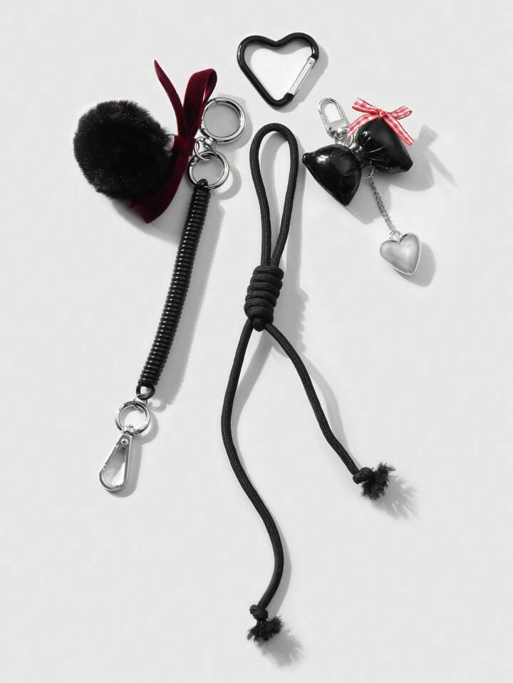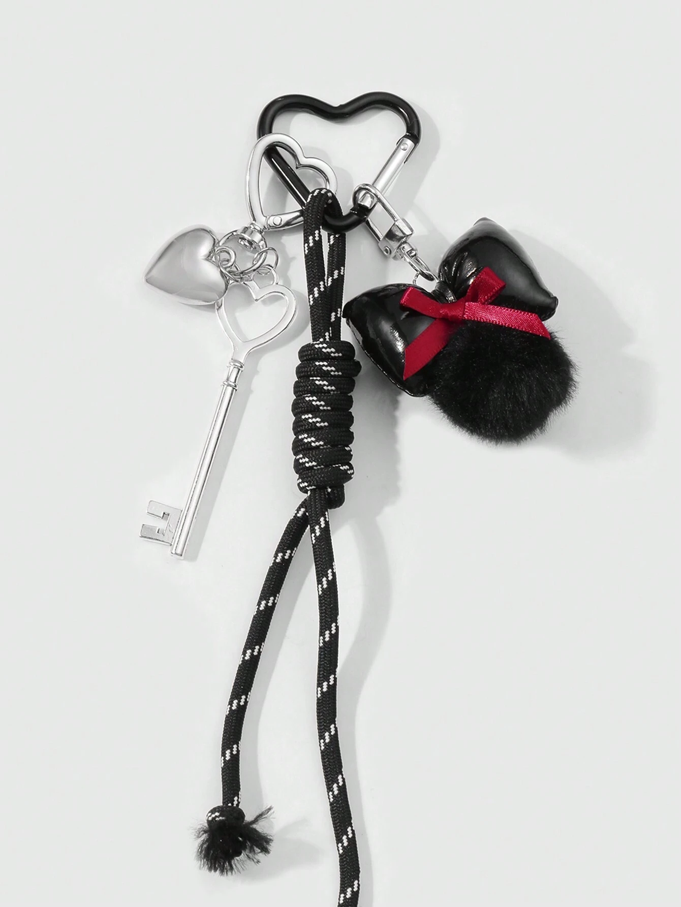 Kawaii 1pc Gothic Style Plush Ball & Leather Bowknot Heart DIY Keychain, Black & Burgundy, Adjustable Strap, Fashionable Accessory For Women & Girls, Gift Valentines
