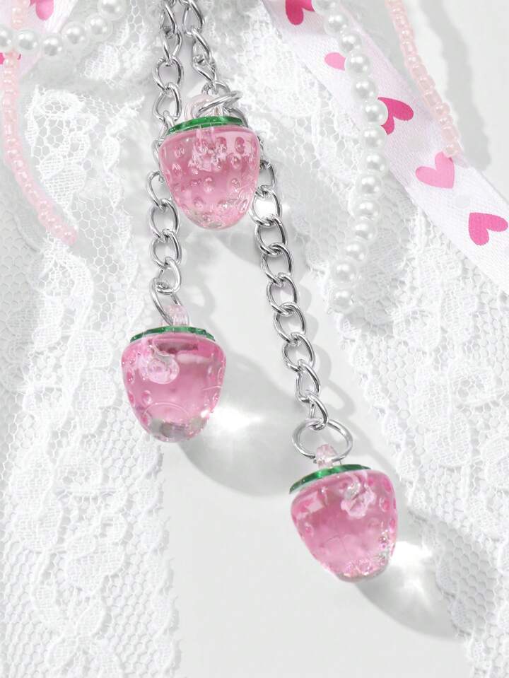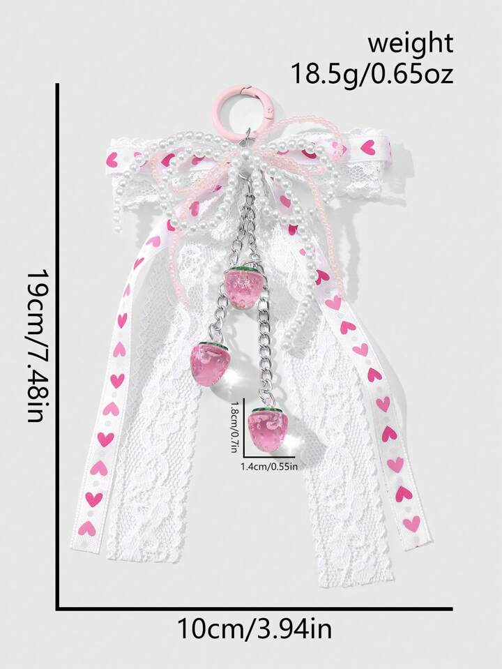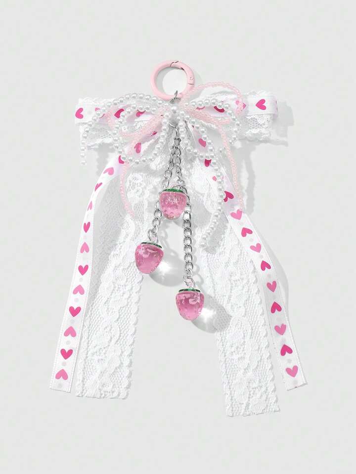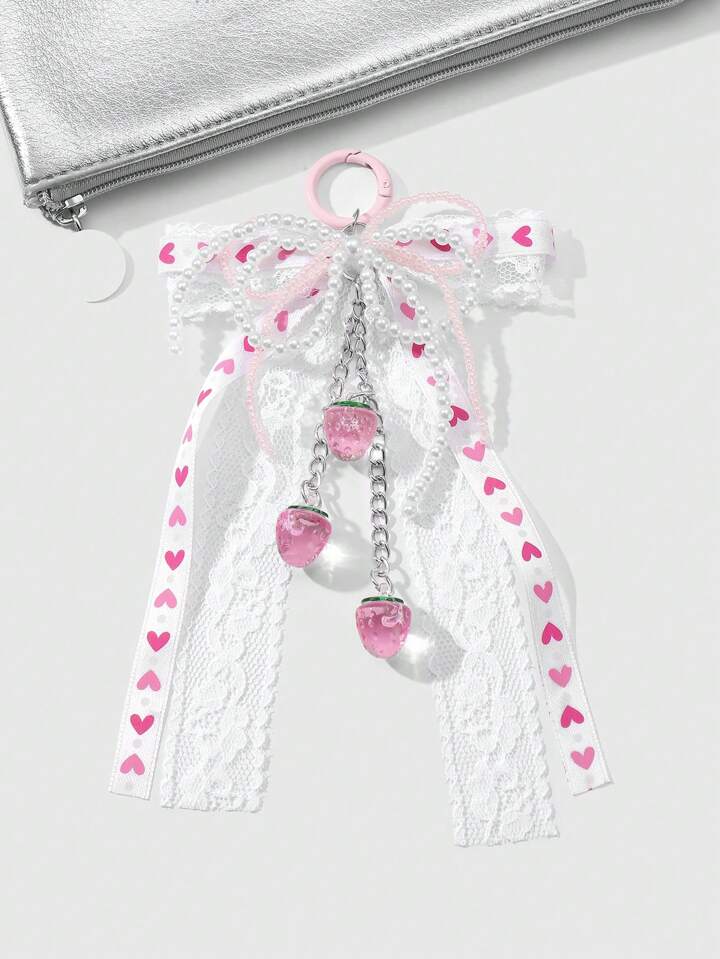 Kawaii 1pc Handmade Cute & Elegant Girl's White Faux Pearl & Crystal Net Fabric Printed Heart, Ribbon Bow, Silver Chain, Resin Strawberry Pendant Keychain/Bag Charm, Suitable For Daily Wear, Holiday Gift