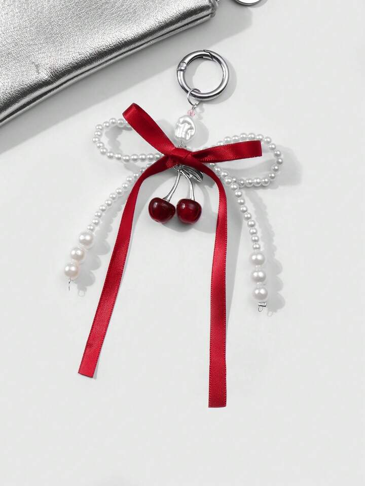 Kawaii 1pc INS Korean Style Sweet & Simple Casual Handmade Beaded White Faux Pearl & Red Ribbon Bow Faux Cherry Pendant Keychain Bag Charm, Suitable For Girls & Women, Gift Valentines