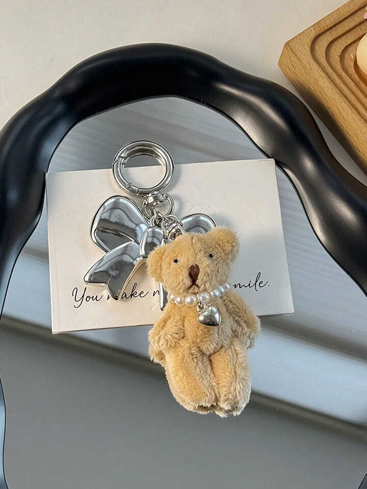 Kawaii 1pc Korean Cute Pearl Big Bow Brown Bear Heart Car Keychain, Earphone Pendant, Phone Case, Bag Charm, Keyring