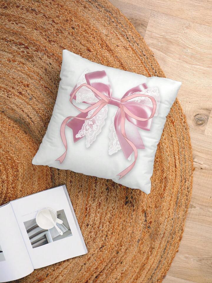 Kawaii 1pc Lace Bow Pattern Throw Pillow Cover, No Pillow Insert, Velvet Printed Square Cushion Cover, Suitable For Living Room, Bedroom, Home Decor, Sofa Throw Pillow, Car Pillow, Applicable For All Seasons, SKU 1294327