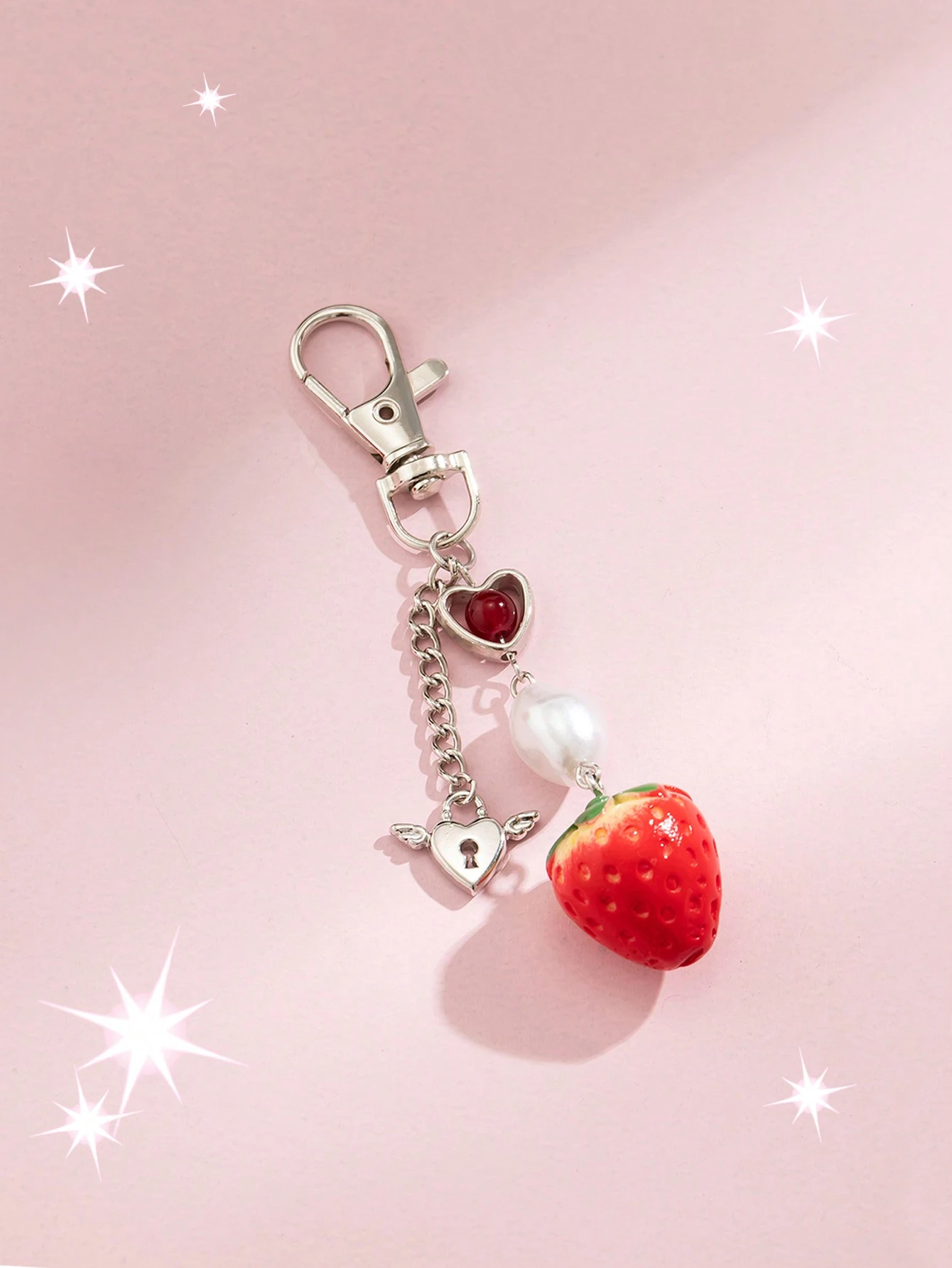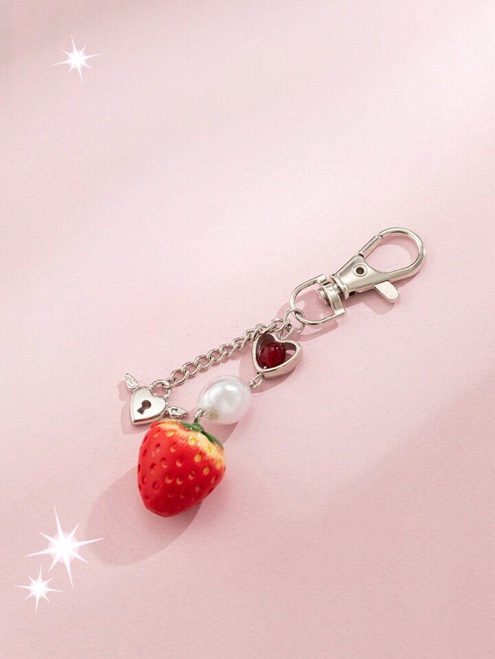 Kawaii 1pc Sweet And Lovely Style Pearl, Strawberry And Heart Shaped Lock Pendant Keychain