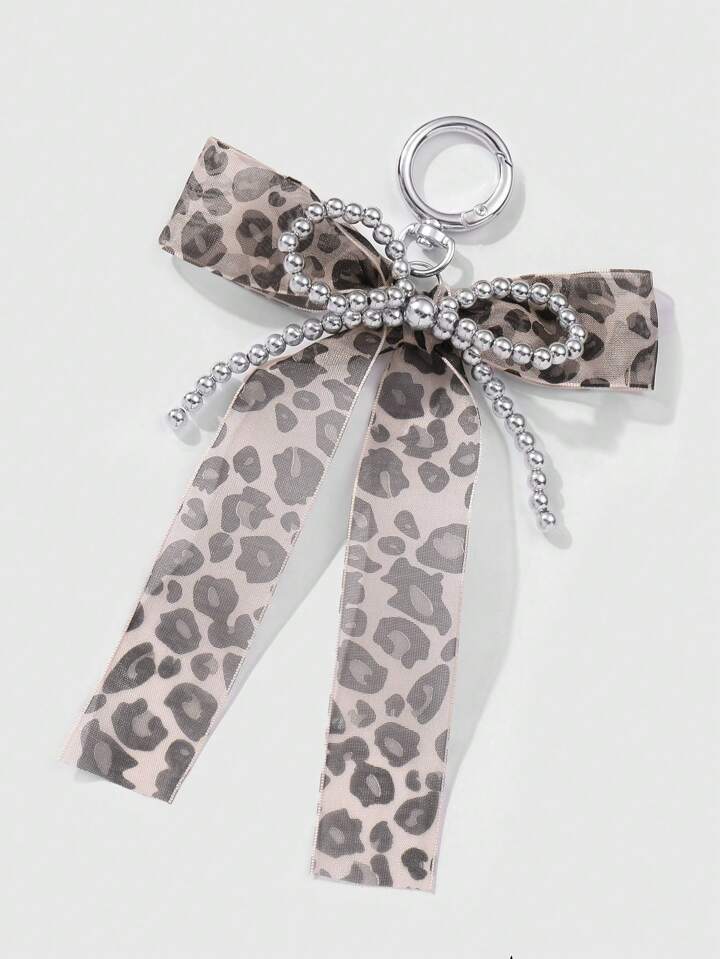 Kawaii 1pc Sweet & Chic Handmade Beaded Silver CCB Leopard Print Lace Bow Keychain Bag Charm, Suitable For Girls, Everyday Wear Or Gift