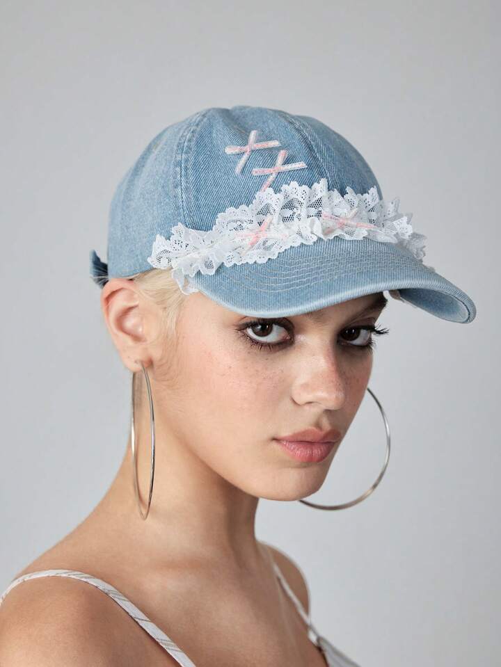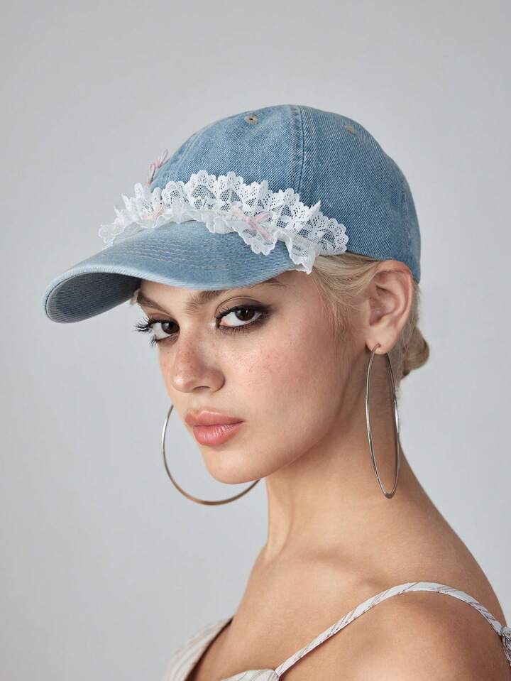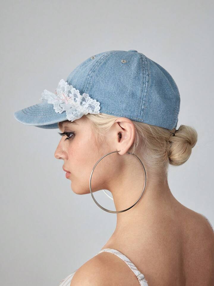 Kawaii 1pc Women's Denim Baseball Cap With Lace Bow Decor