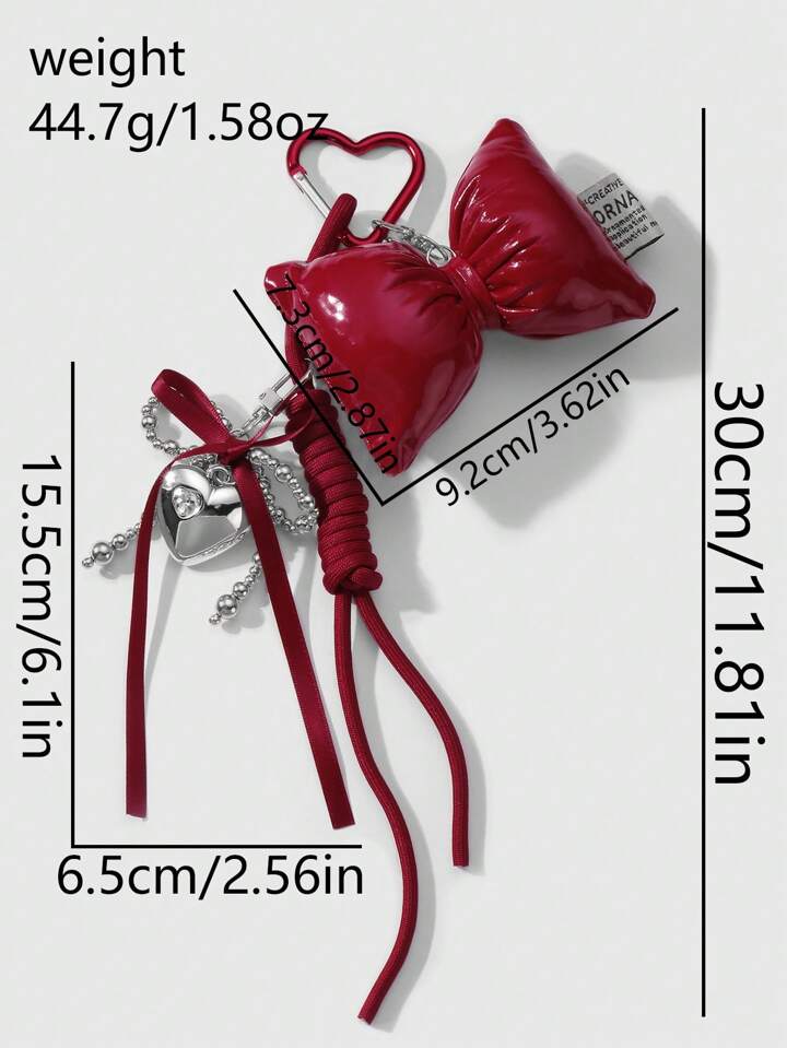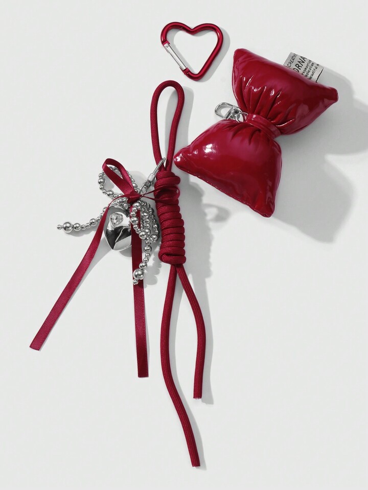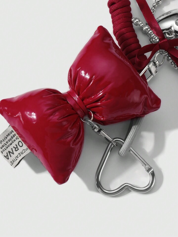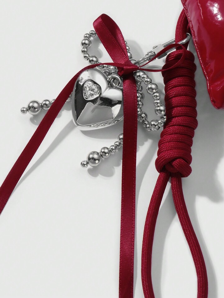 Kawaii 1pc Y2K Cute & Stylish Versatile High-Quality Handmade CCC Beaded Silver & Burgundy Ribbon Bow Rhinestone Heart Adjustable Climbing Rope DIY Keychain, Bag Charm - Suitable For Women/Girls, Holiday Gift