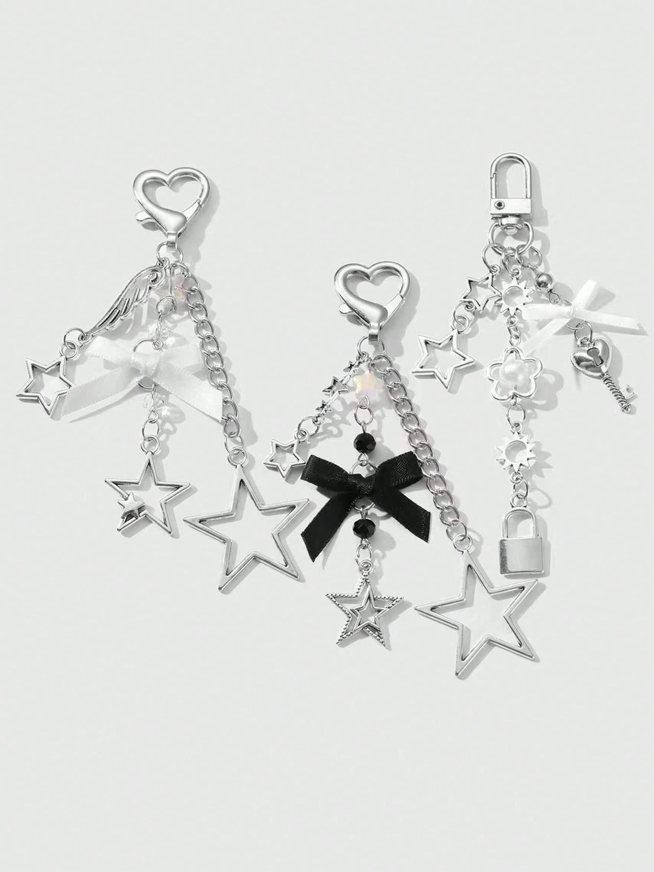Kawaii 1pc Y2K Minimalist Fashionable Delicate High-Quality Silver Chain Resin Faux Pearl Faux Crystal Round Bead Hollow Wing Sunflower Ribbon Bow Heart Lock Hollow Star Pendant Decor DIY Keychain Bag Charm, Suitable For Sisters, Best Friends, Couples, Women, Daily Wear, Holiday Gift