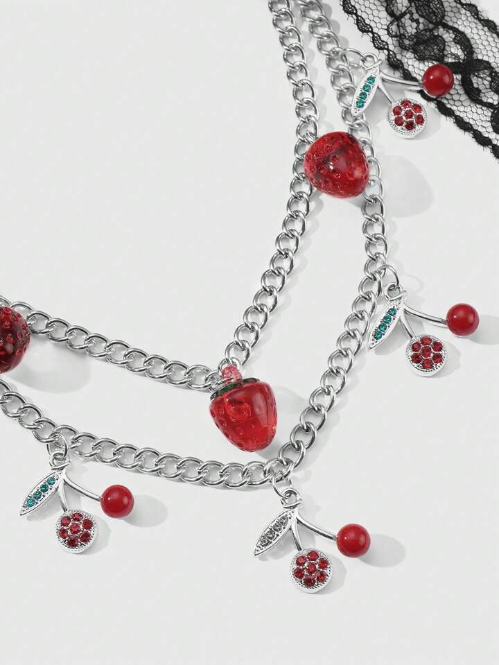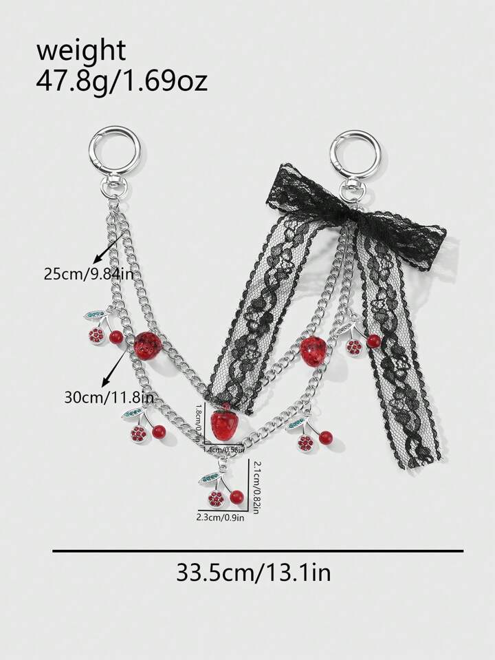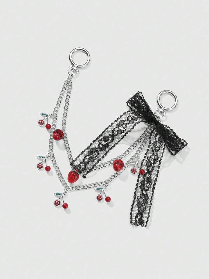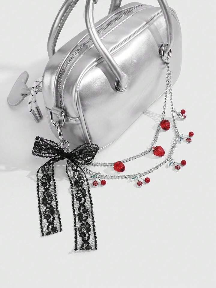 Kawaii 1pc Y2K Retro & Fashionable Luxury High-Quality Silver Multi-Layer Chain, Resin Strawberry, Crystal, Lace Bow Decor DIY Keychain, Bag Charm - Suitable For Women, Daily Wear, Holiday Gift