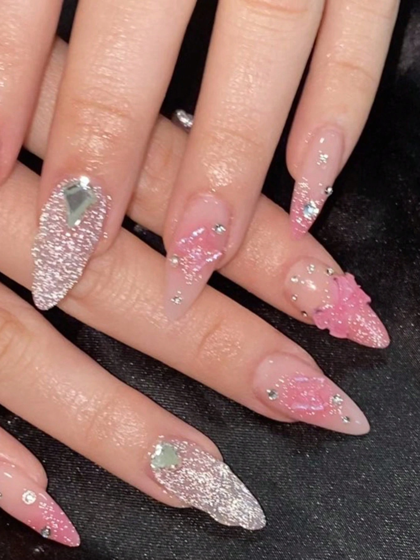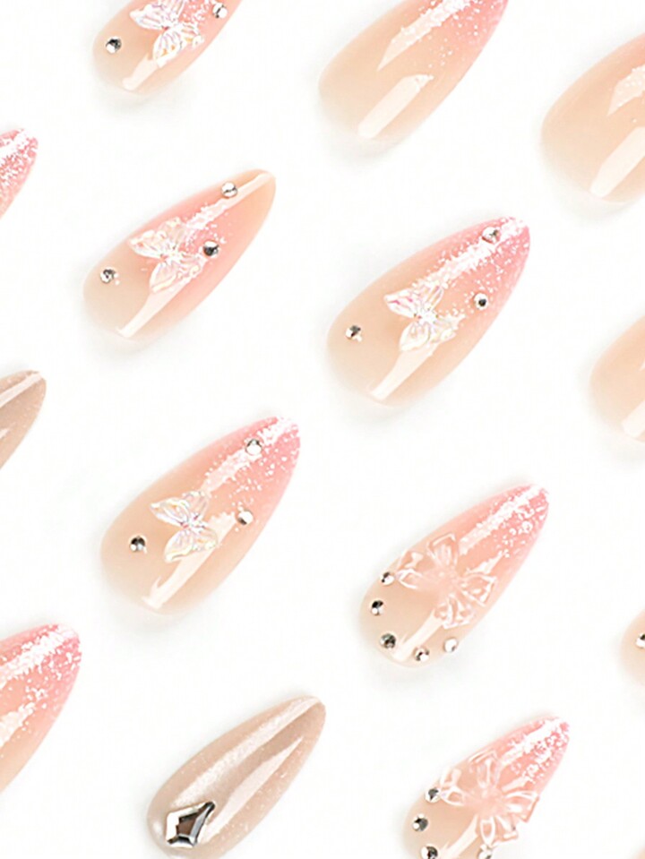 Kawaii 1set (24pcs) Pink Zirconia Decorated Nail Art