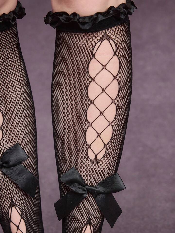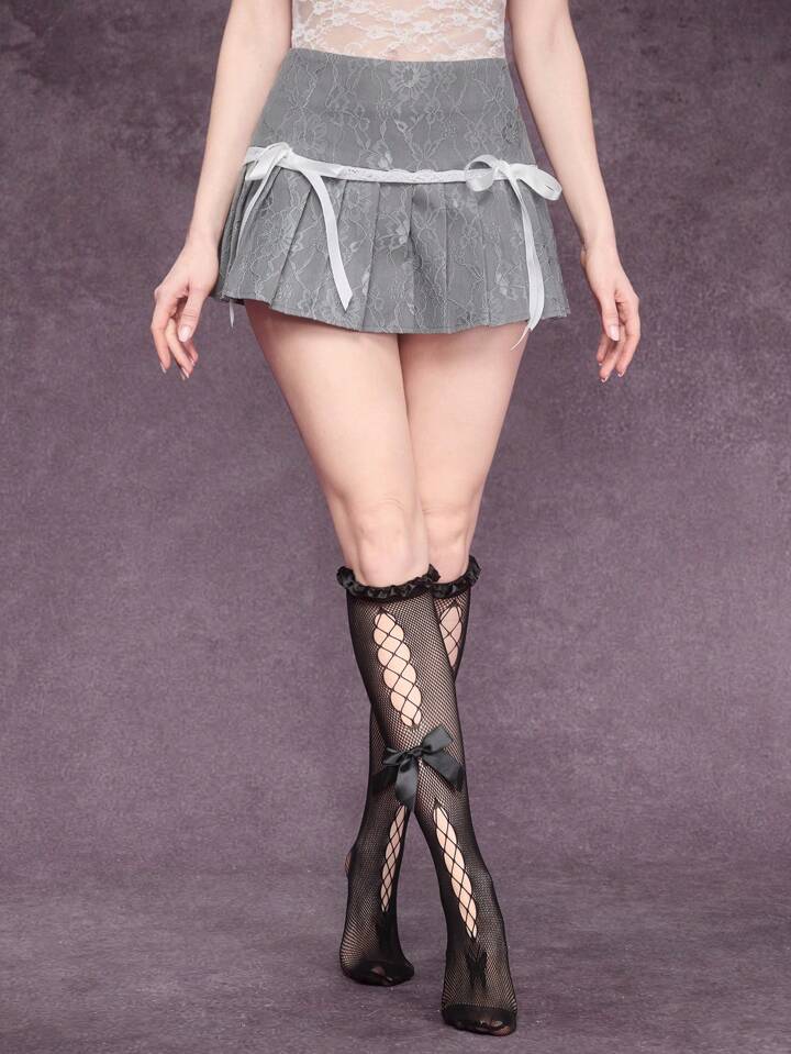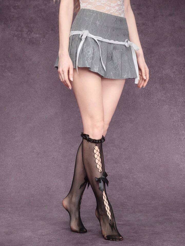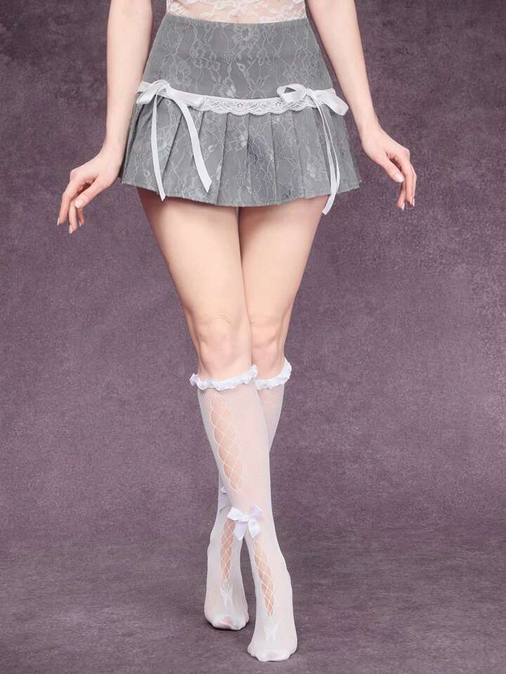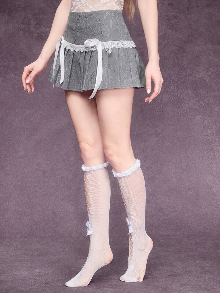 Kawaii 2 Pairs Women Knee High Socks With Bow Lace Hollow Out Design, Cute, Straight Tube
