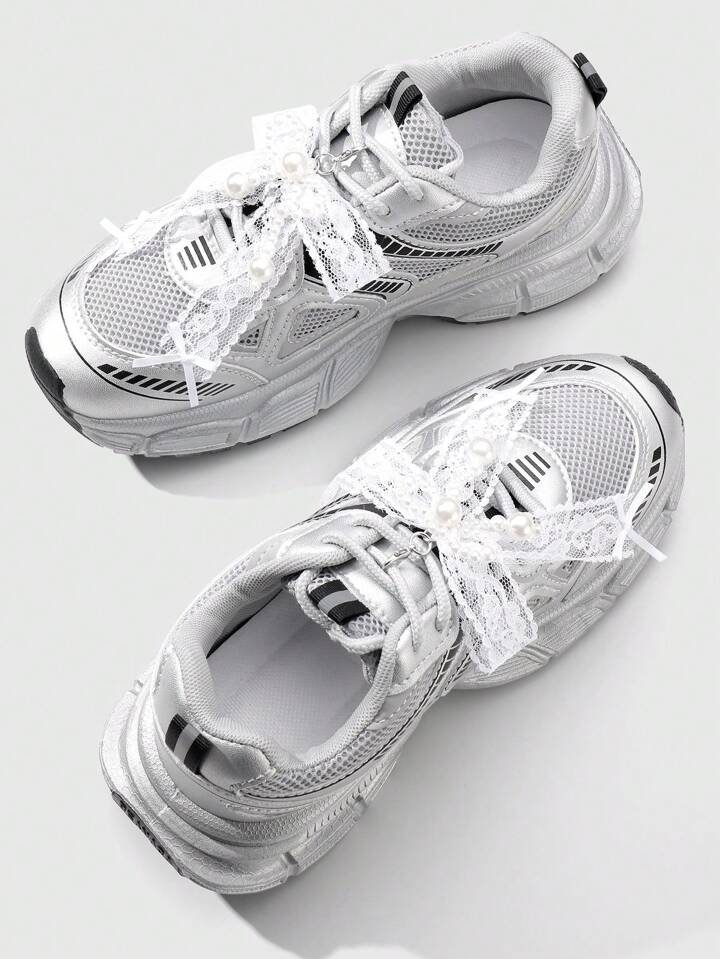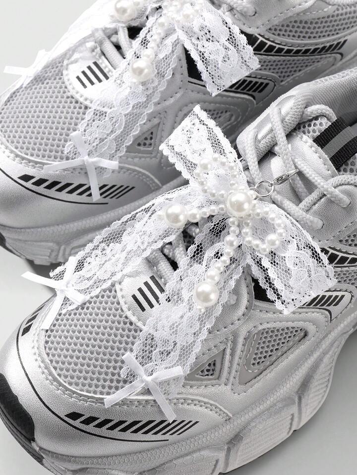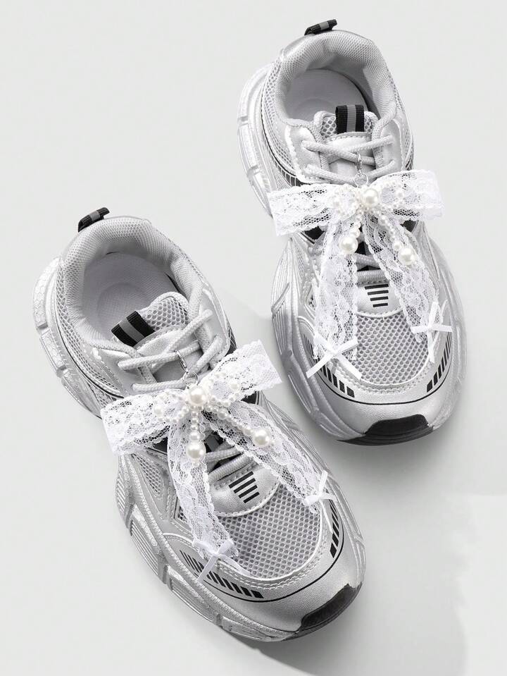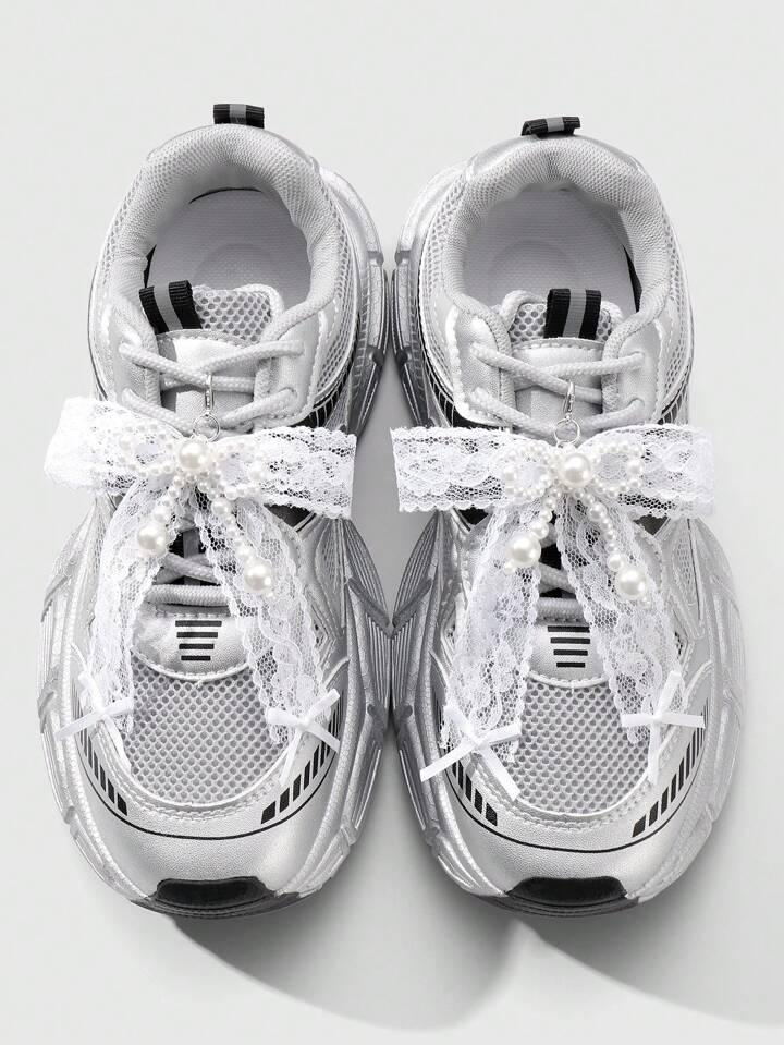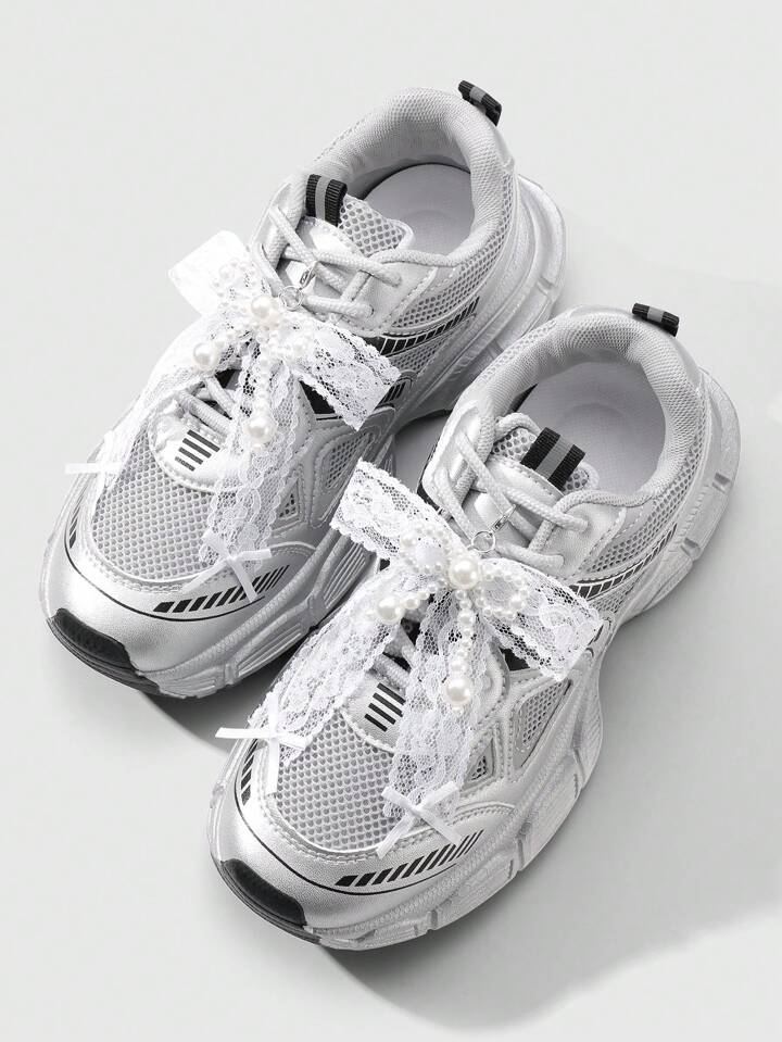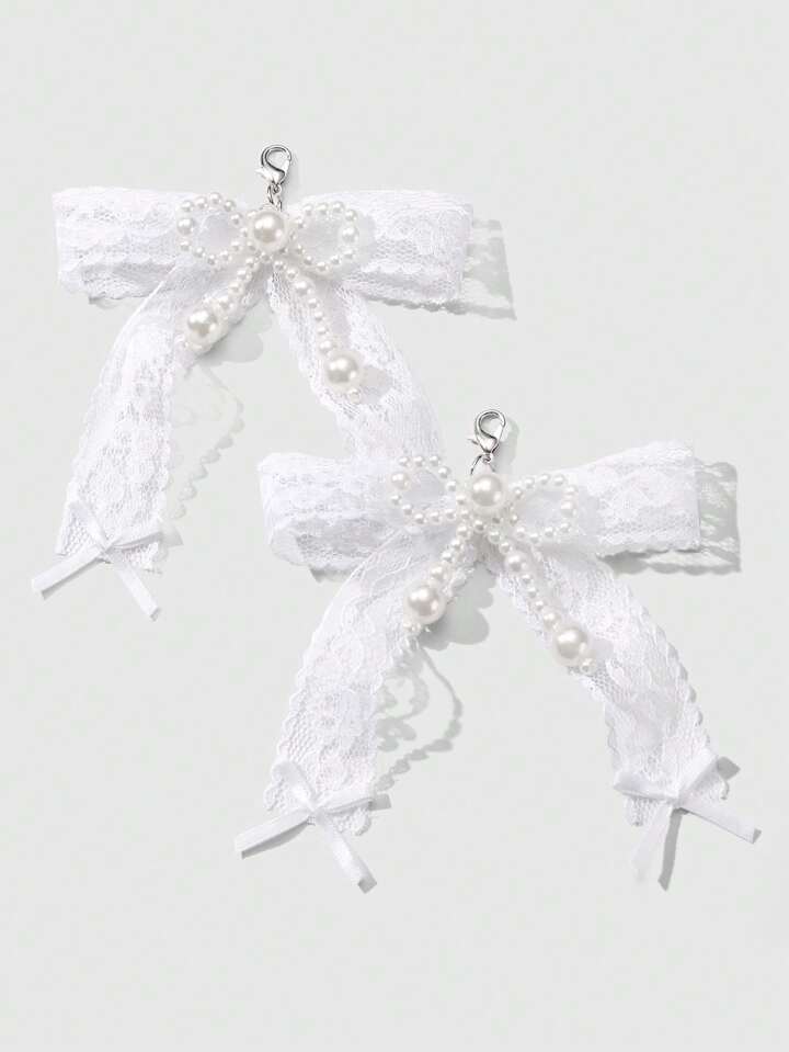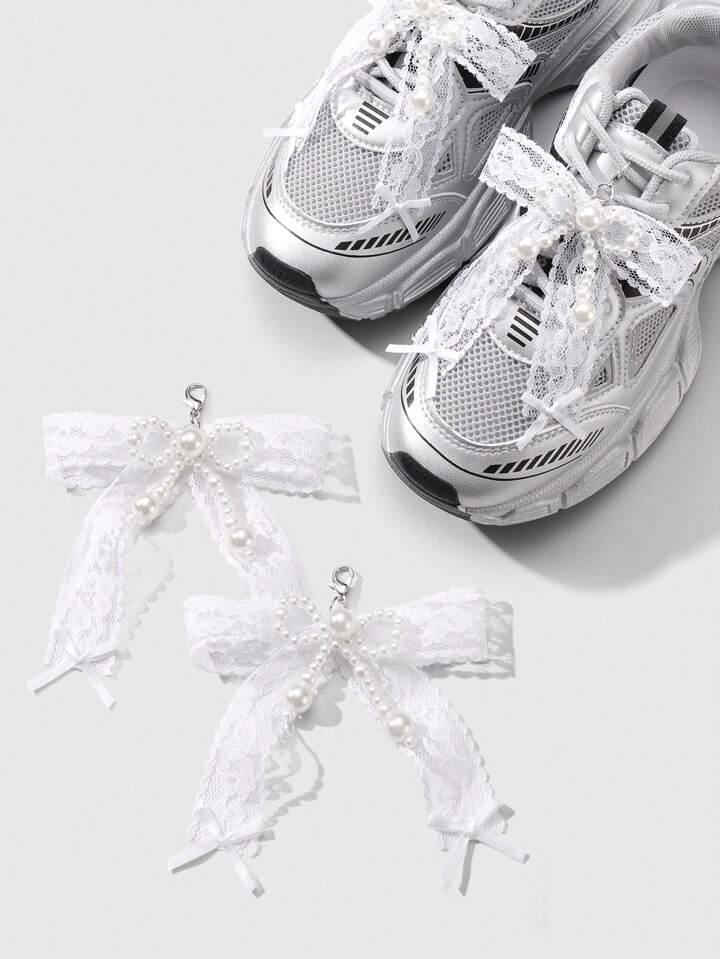 Kawaii 2 Pcs Handmade Beaded White Faux Pearl Net Lace Bowknot Shoe Clips, Minimalist & Elegant Fashion Accessories, Versatile For Women, Suitable For Daily Wear And Gifts