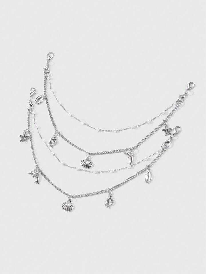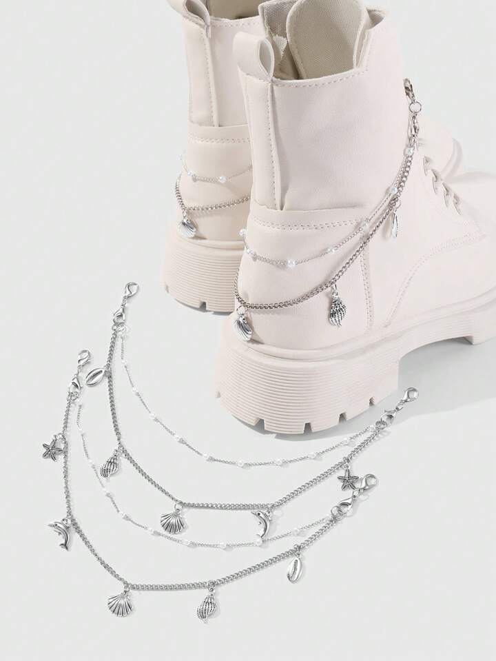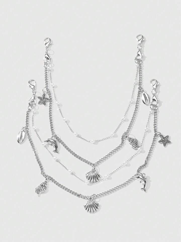 Kawaii 2 Pcs Y2K Luxurious Elegant Minimalist Fashion Versatile High-End Silver Multilayer Chain With Faux Pearl, Shell, Starfish Pendant Adjustable Lobster Clasp Shoe Strap Decoration Set, Suitable For Women, Daily Matching, Holiday Gift