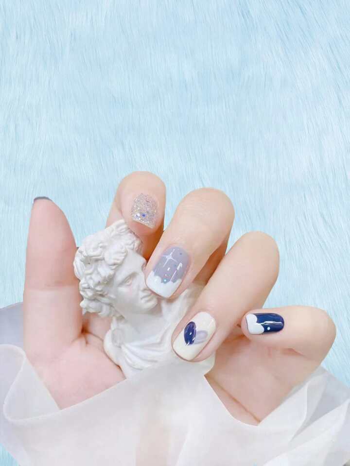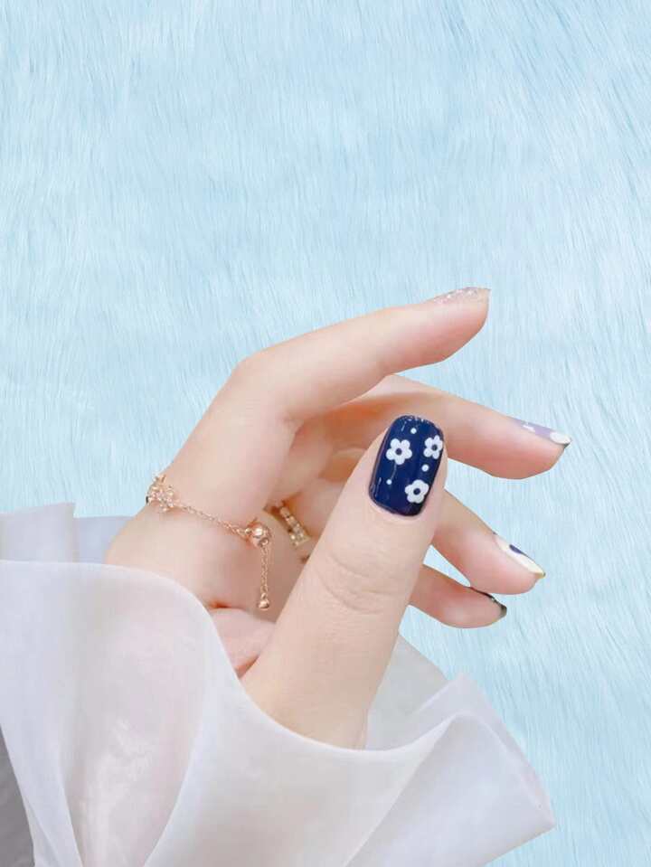 Kawaii 24pcs Short Square Heart Pattern Fake Nail & 1sheet Nail Tape