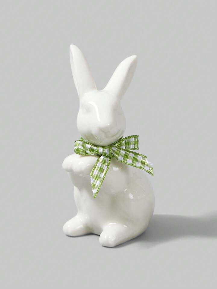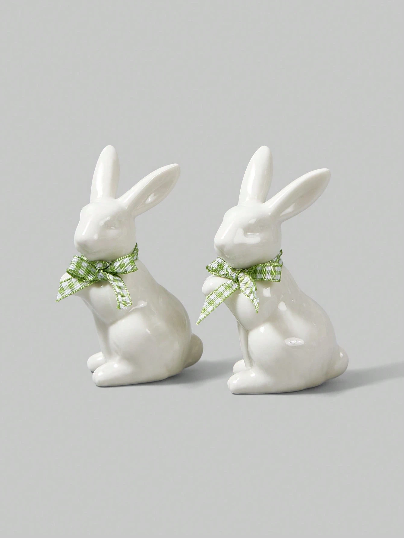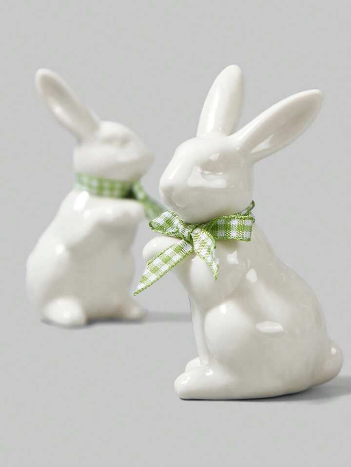 Kawaii 2pcs Cute Easter Rabbit & Bowknot Ceramic Ornaments, Rustic Style Desktop Decor, Daily & Party Decoration (Ceramic Crafts, Minor Defects On The Bottom Are Normal Craftsmanship Phenomena), For Gifts