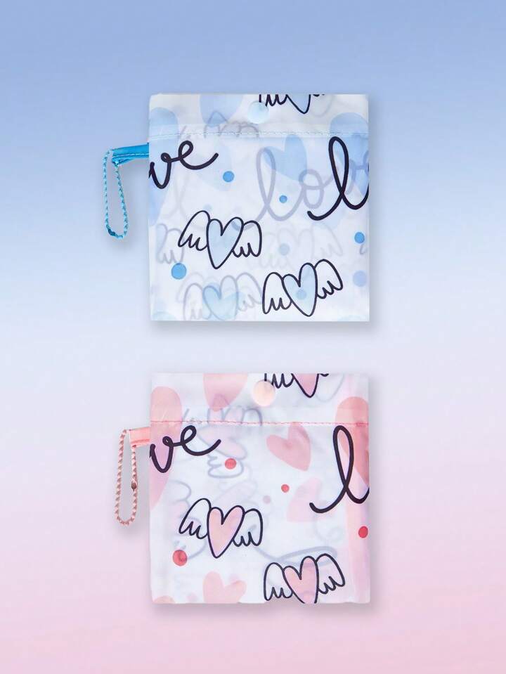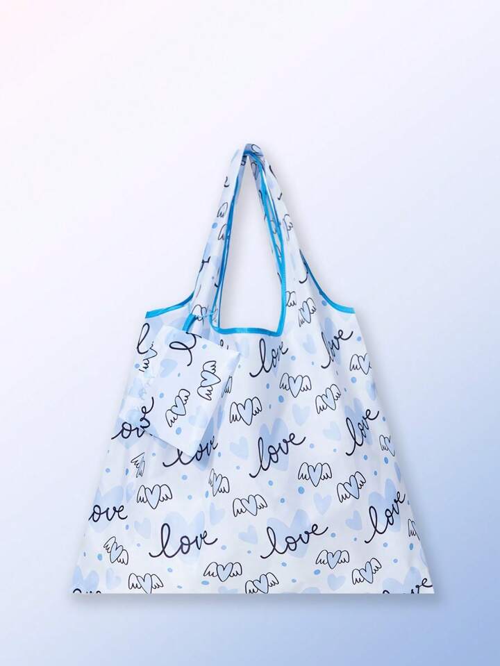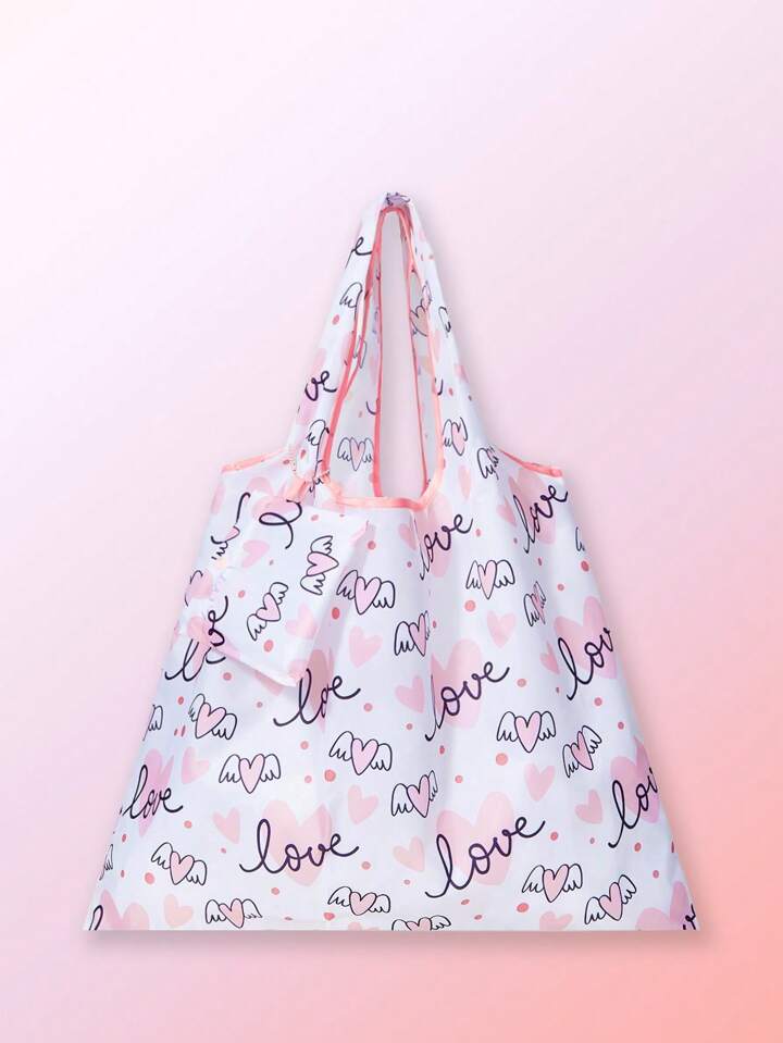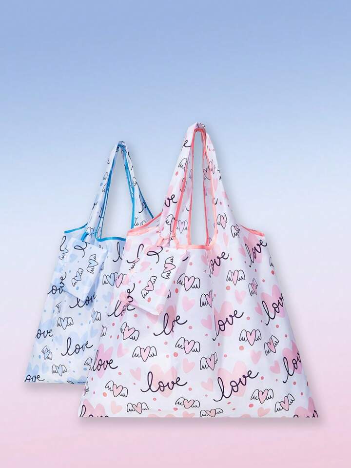 Kawaii 2pcs/Set Cartoon Heart Pattern Foldable Portable Tote Bag For Couples, Valentine'S Day, Outdoor, Grocery Shopping