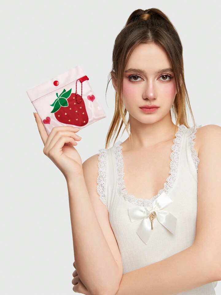 Kawaii 2pcs/Set Cartoon Strawberry Design Storage Bag, Large Capacity Foldable Shopping Tote Bag With Coin Purse Valentines