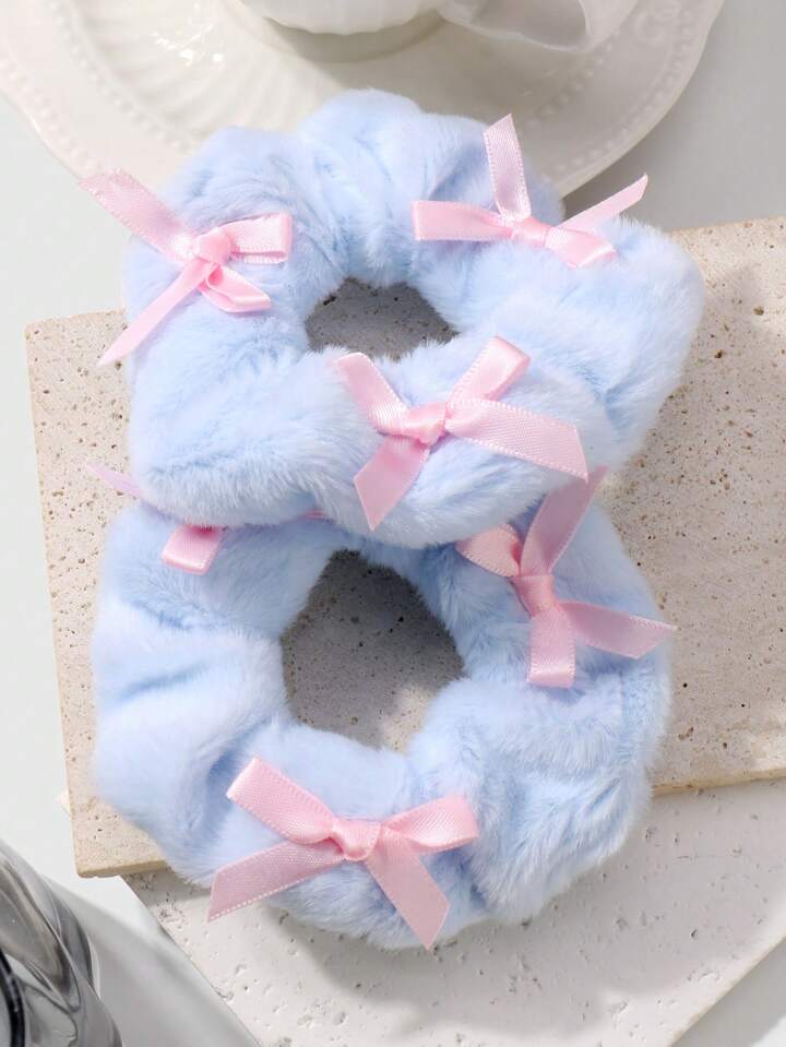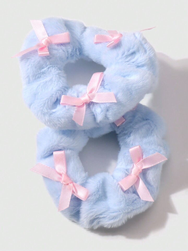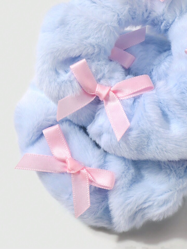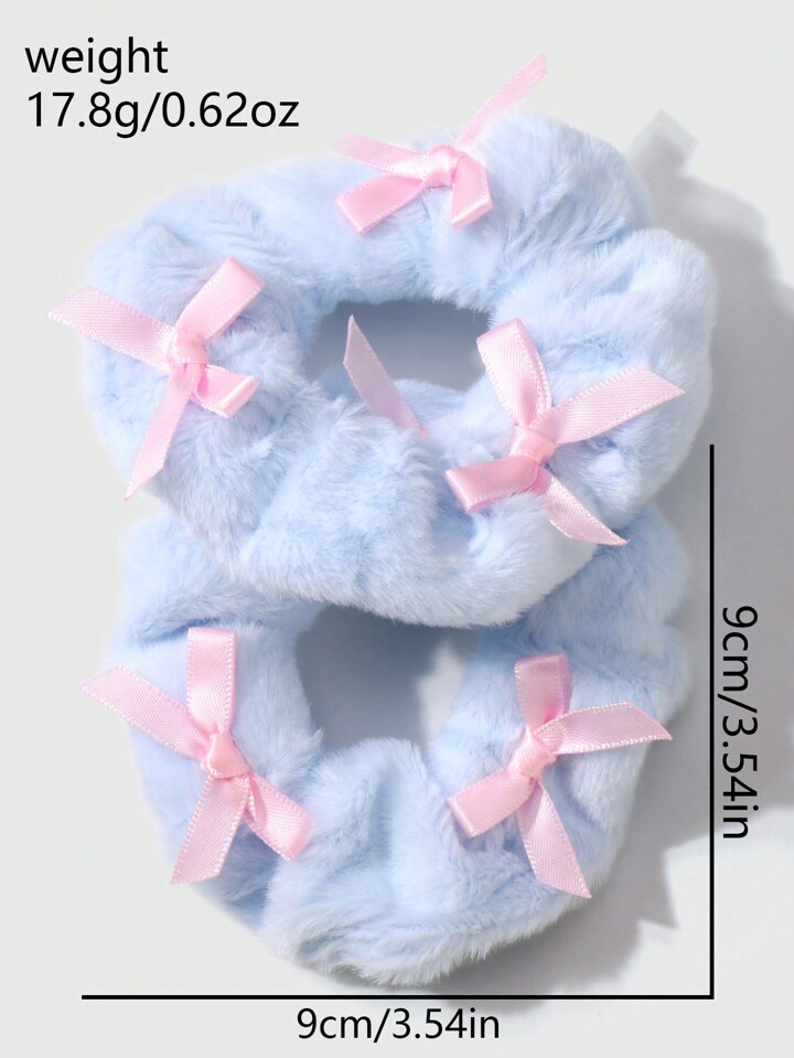 Kawaii 2pcs/Set Fashionable & Cute Blue Plush & Pink Ribbon Bow Scrunchies, Elegant Ponytail Holders Suitable For Women & Girls, Great Gift For Holiday