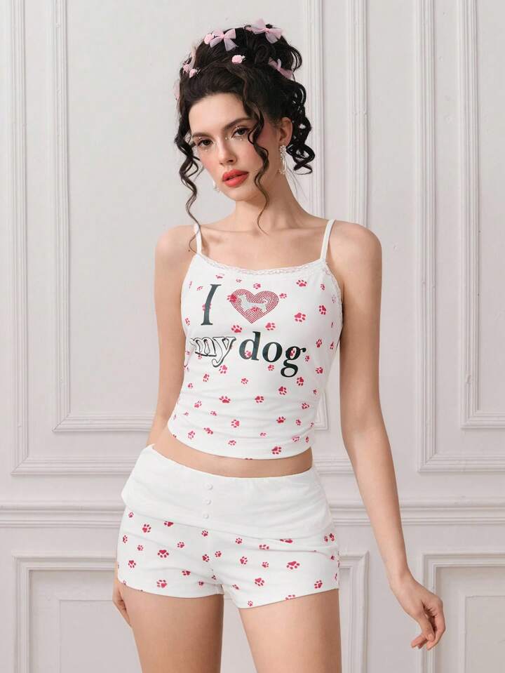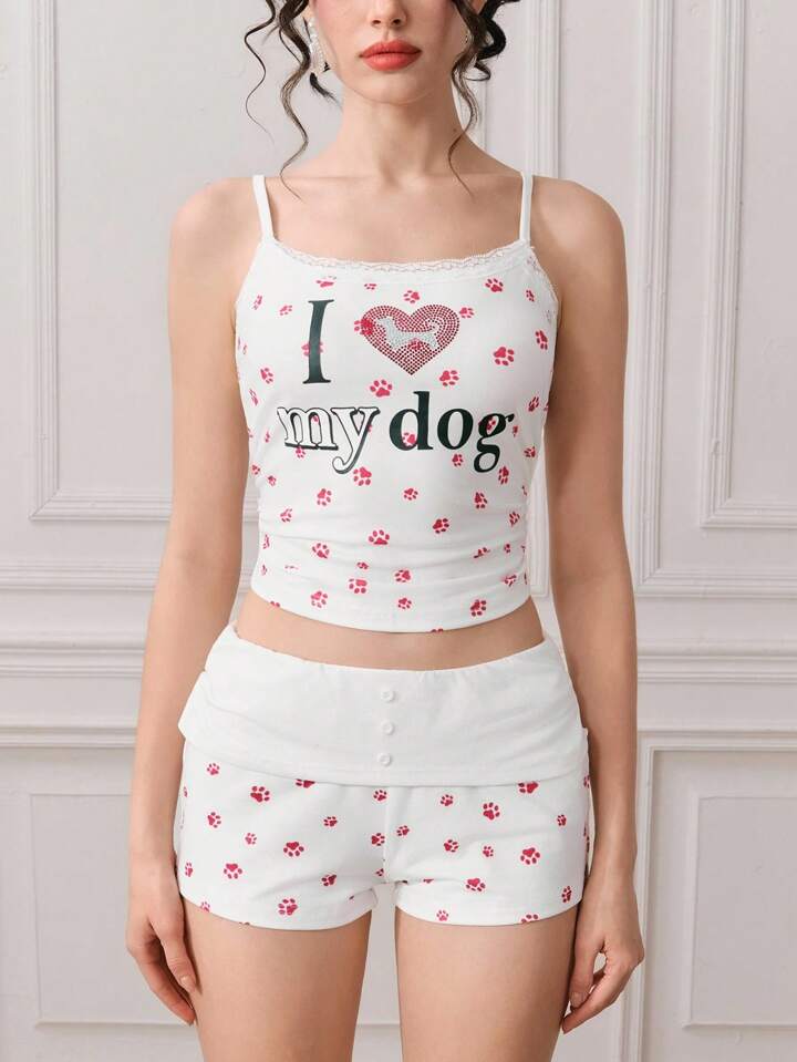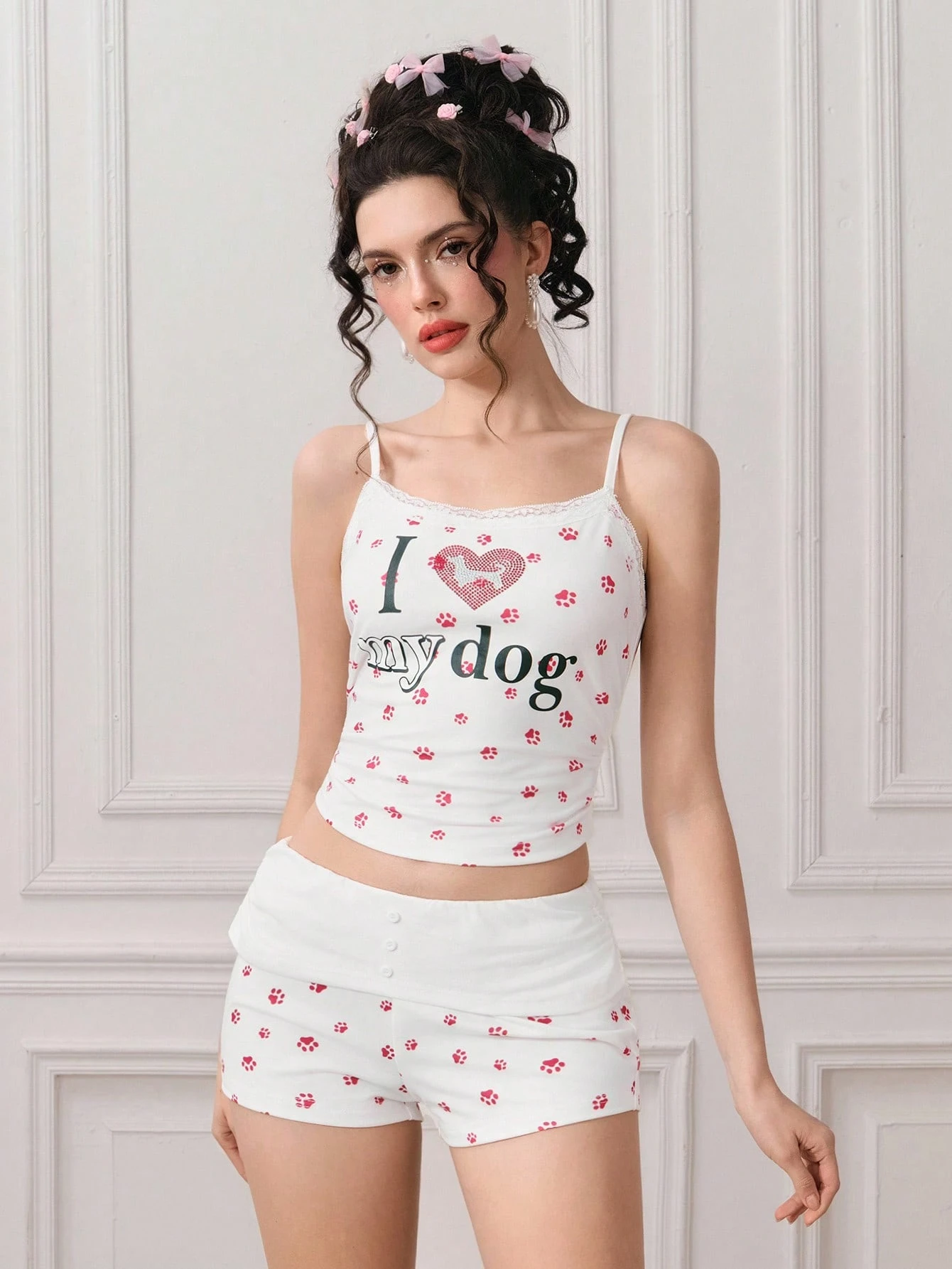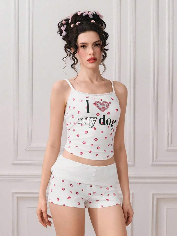 Kawaii 2pcs/Set Women Summer Letter & Heart Print Spaghetti Strap Vest And Shorts Set