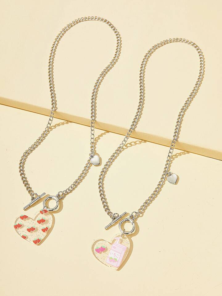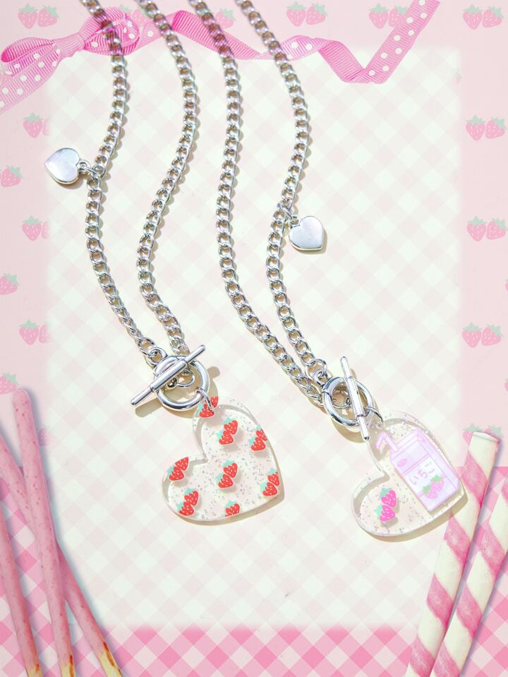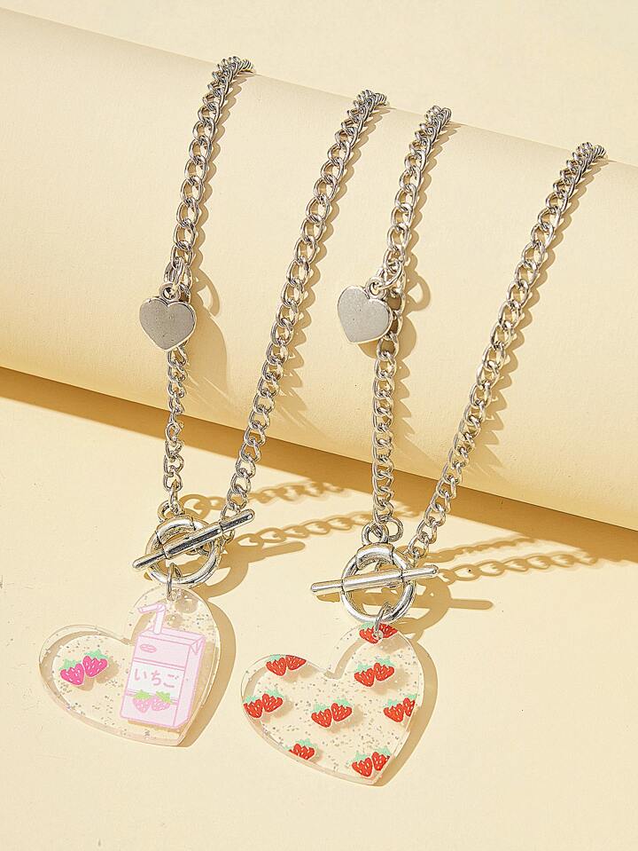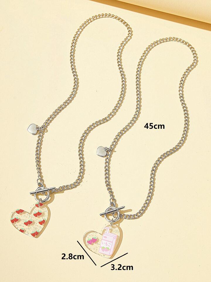 Kawaii 2pcs Strawberry Print Heart Decor Chain Necklace