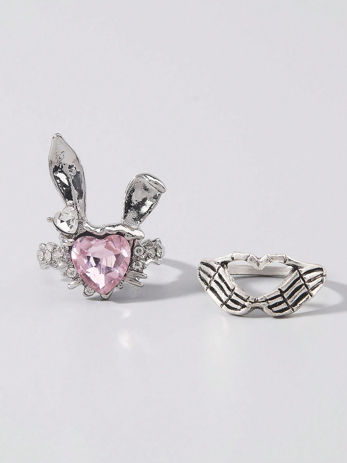 Kawaii 2pcs Y2k Cute Bunny Rhinestone Inlaid, Punk Finger Ring Set, Jewelry Gift