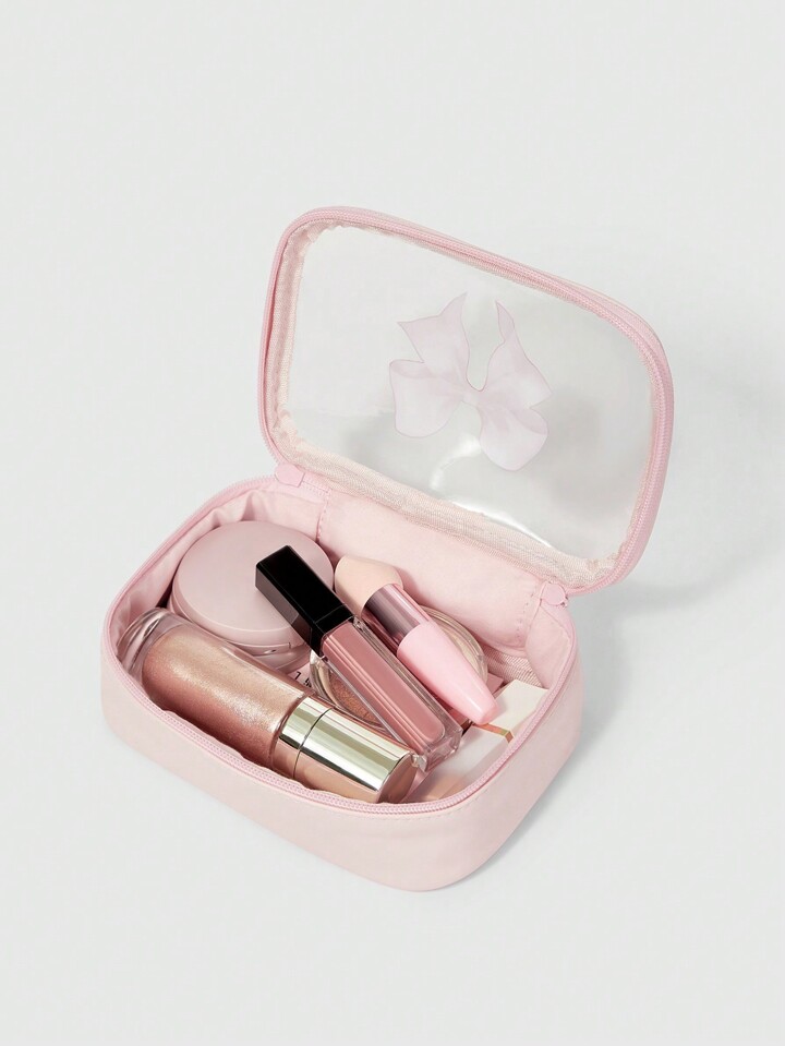 Kawaii 401422 Pink Cute Bow Printed Transparent Insert Storage Bag, Square Shape Portable Cosmetic Organizer