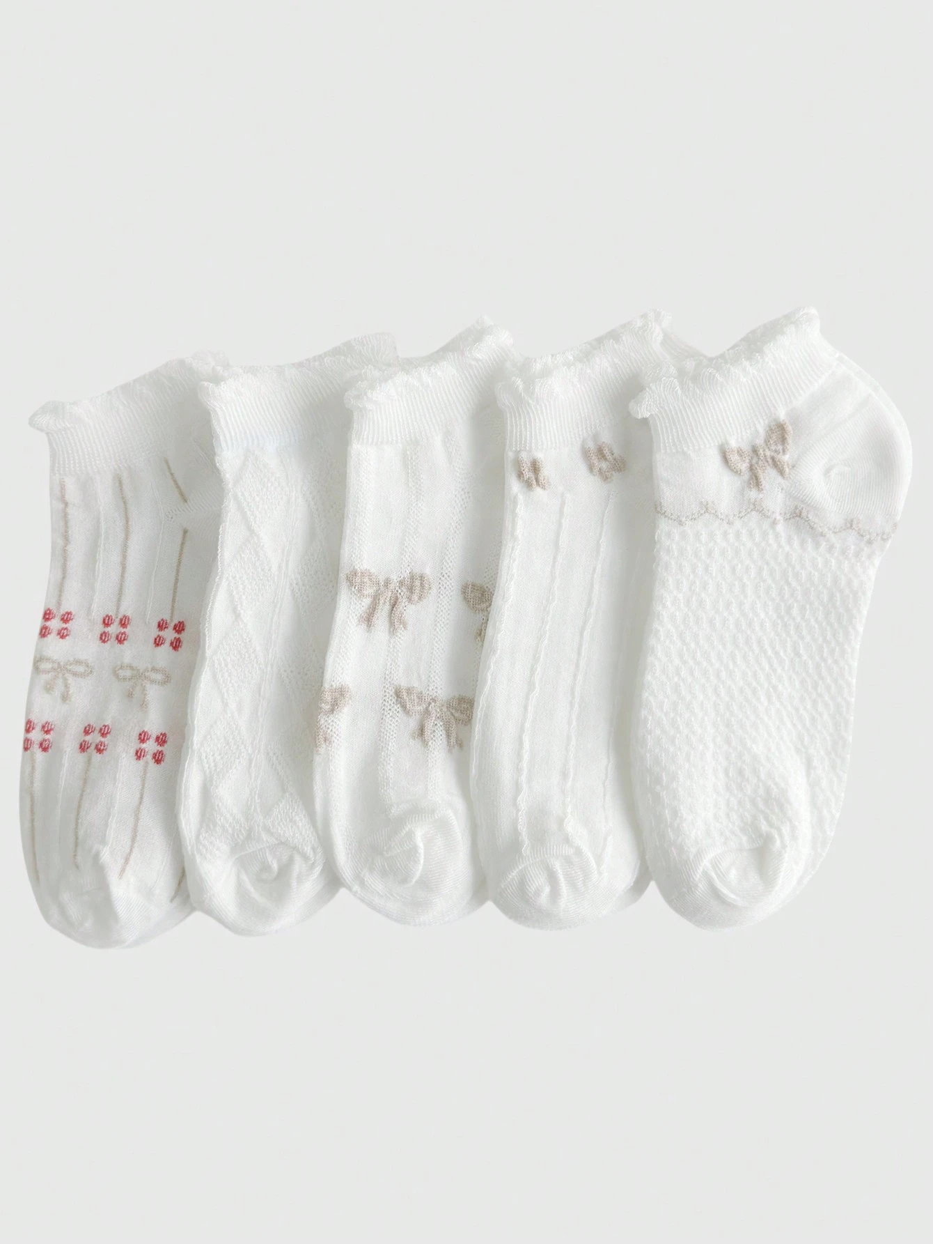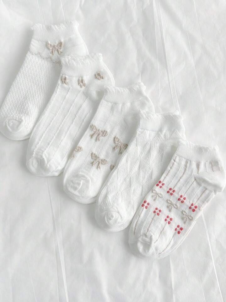 Kawaii 5 Pairs Random Cute Bow Pattern Short Socks, Adorable Bowknot Socks, Versatile School Girl Style Socks For Women