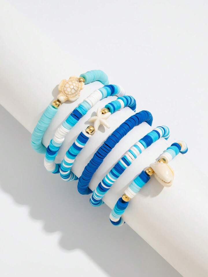Kawaii 6pcs/Set Boho Style Sea Turtle, Starfish, Shell Pendant Beaded Bracelet, Couples Jewelry
