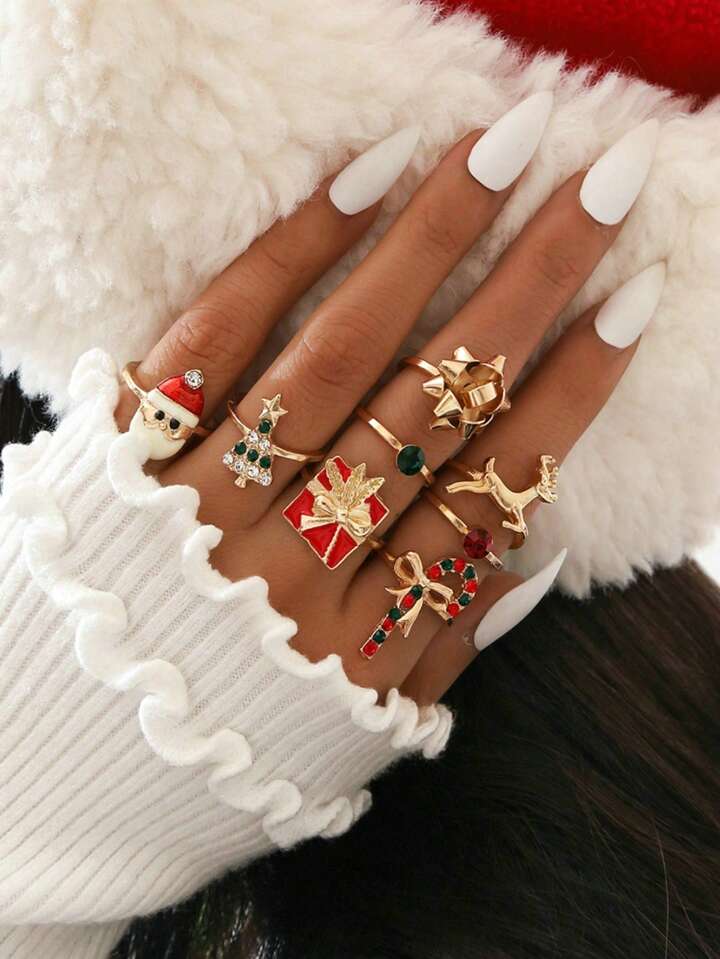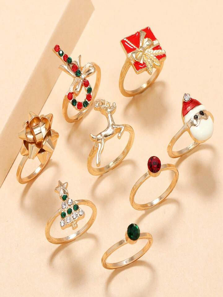 Kawaii 8pcs Cute Zinc Alloy Christmas Elk Rhinestone Decor Ring For Women For Daily Decoration