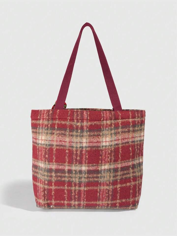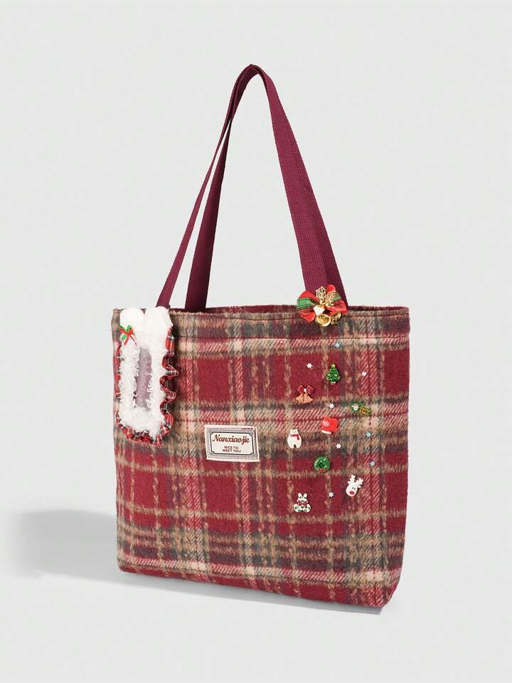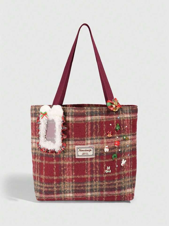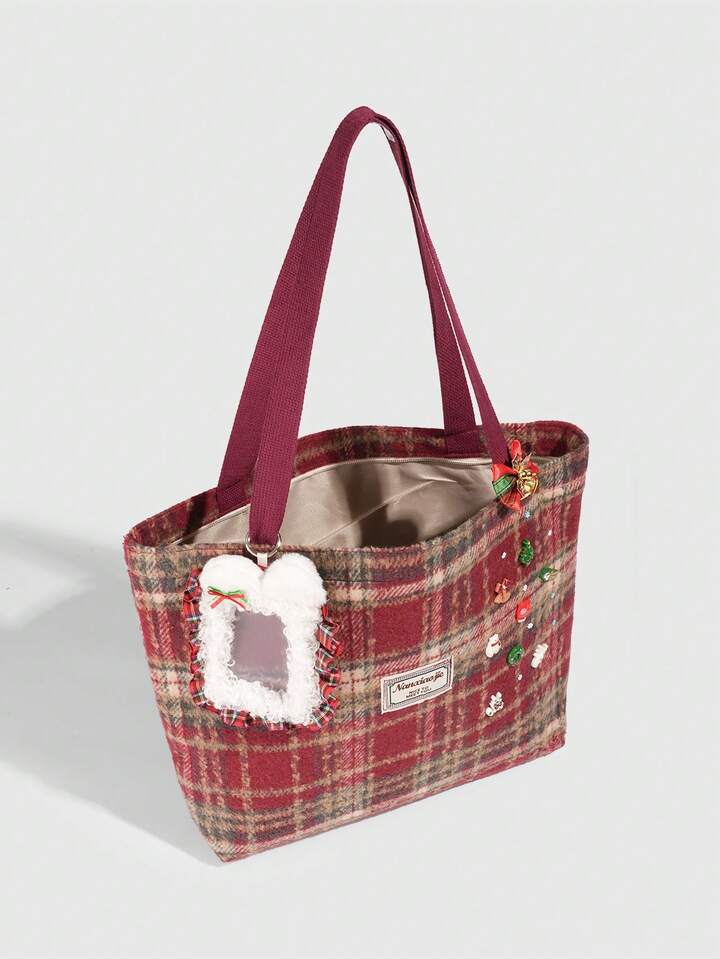 Kawaii A Cute Christmas Wine Red Plaid Tote Bag, A Large Capacity Autumn And Winter Woolen Shoulder Bag, A High-End Christmas Bow, A Reind, A Plush Card Holder Decorated Handbag