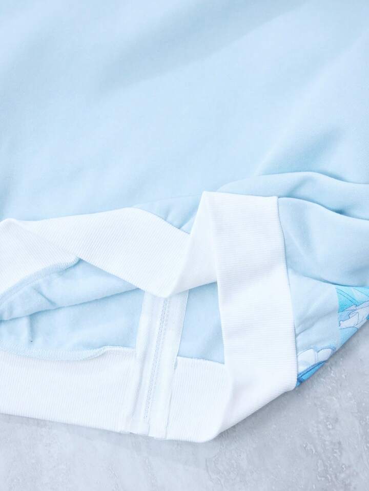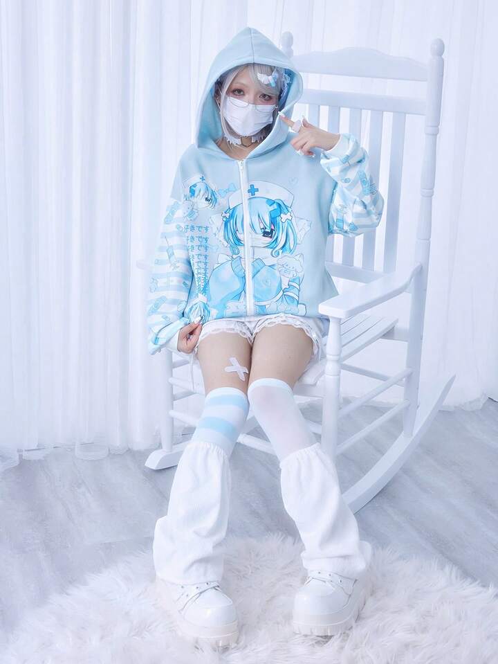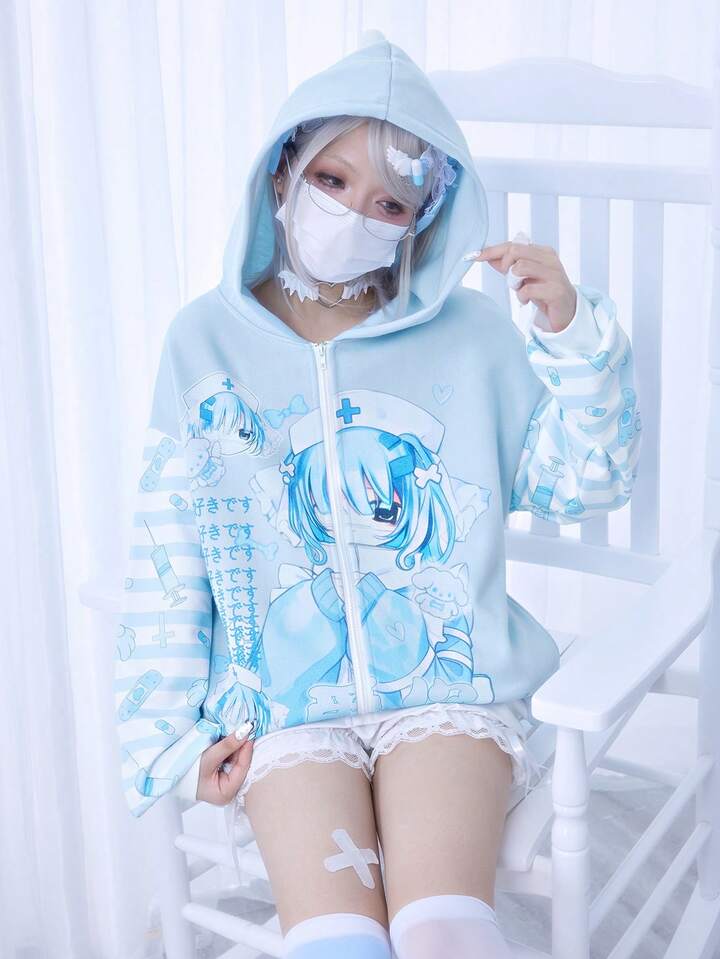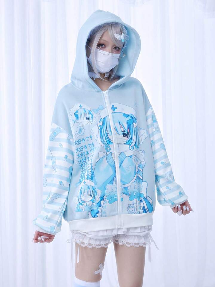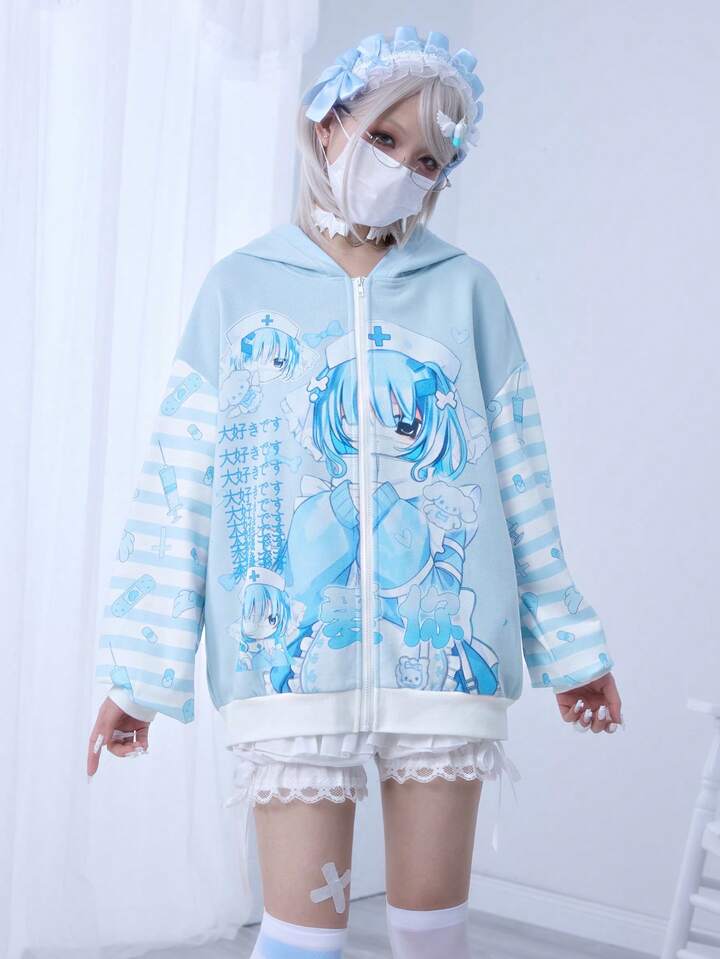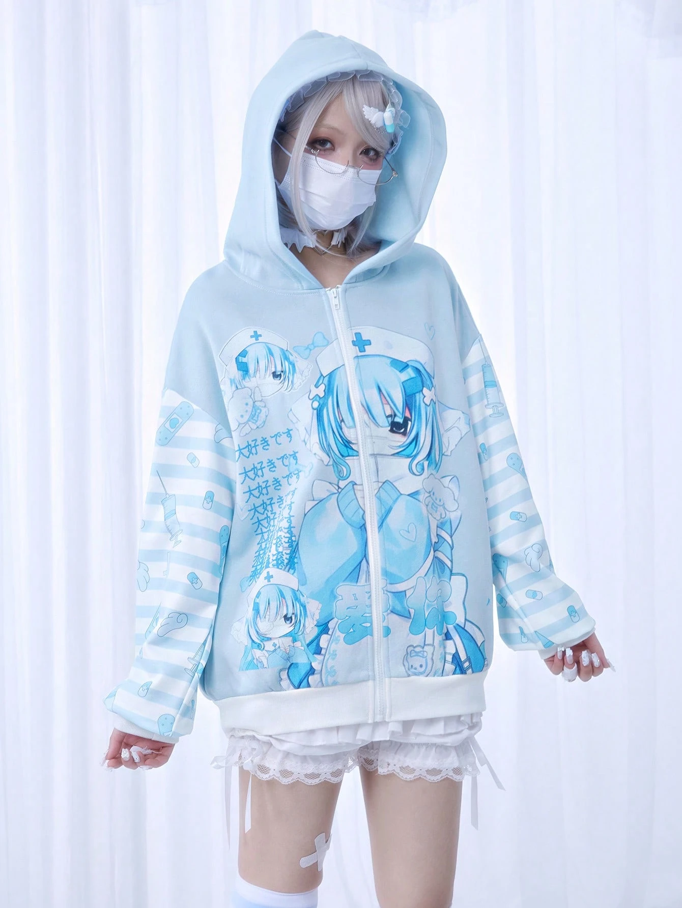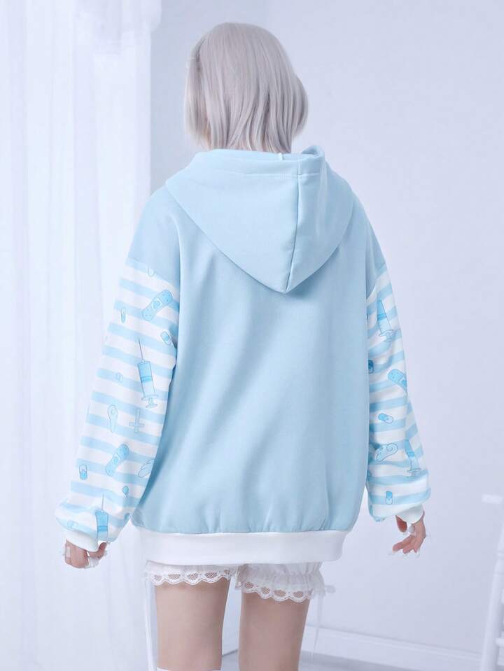 Kawaii Anime Style Blue & White Plaid Contrast Stripe Print Hooded Loose Sweatshirt Jacket