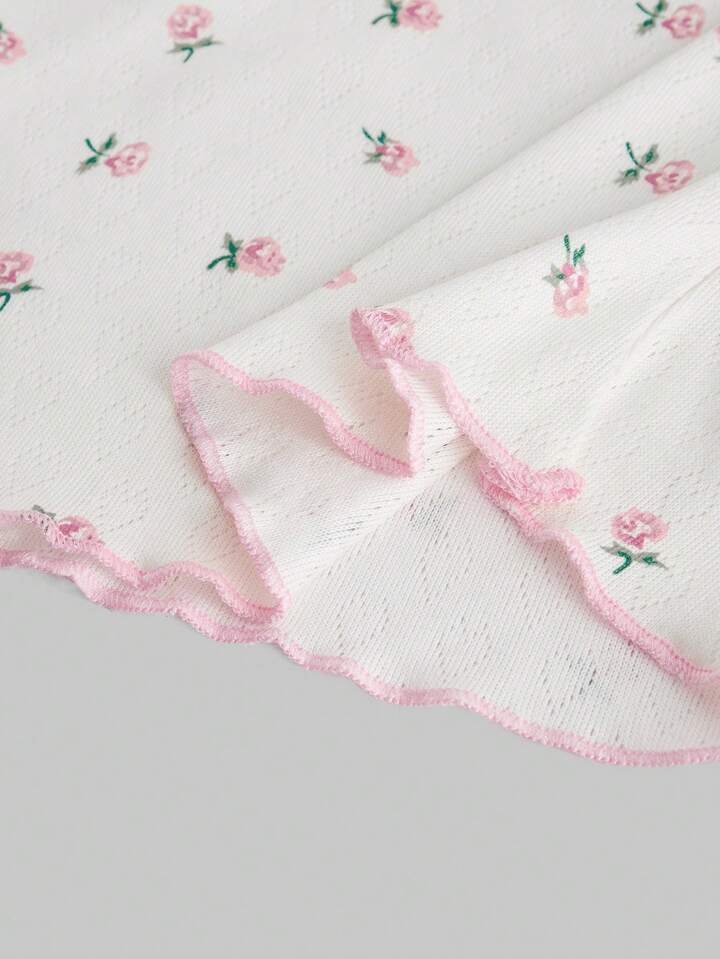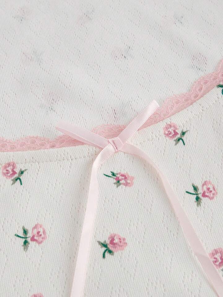 Kawaii Boho Casual Bowknot T-Shirt With Elastic Band Ditsy Floral Design For Women, School