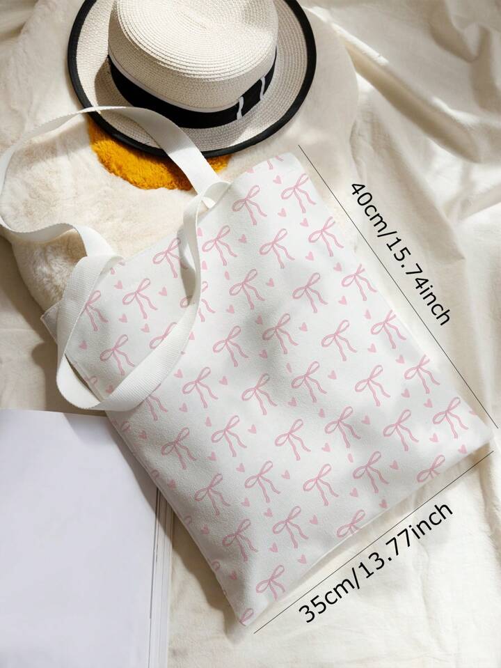 Kawaii Bow & Heart Pattern Double-Sided Print Shoulder Canvas Tote Bag, Artistic Style School Bag & Book Bag For Women Or Students, Perfect For Books, Shopping, Back To School And More, Fashionable Bow Purse For Women, Cute Bow Bag For Women