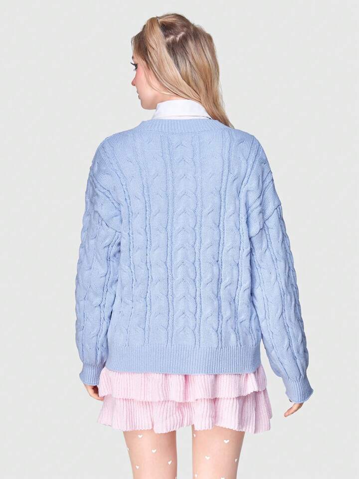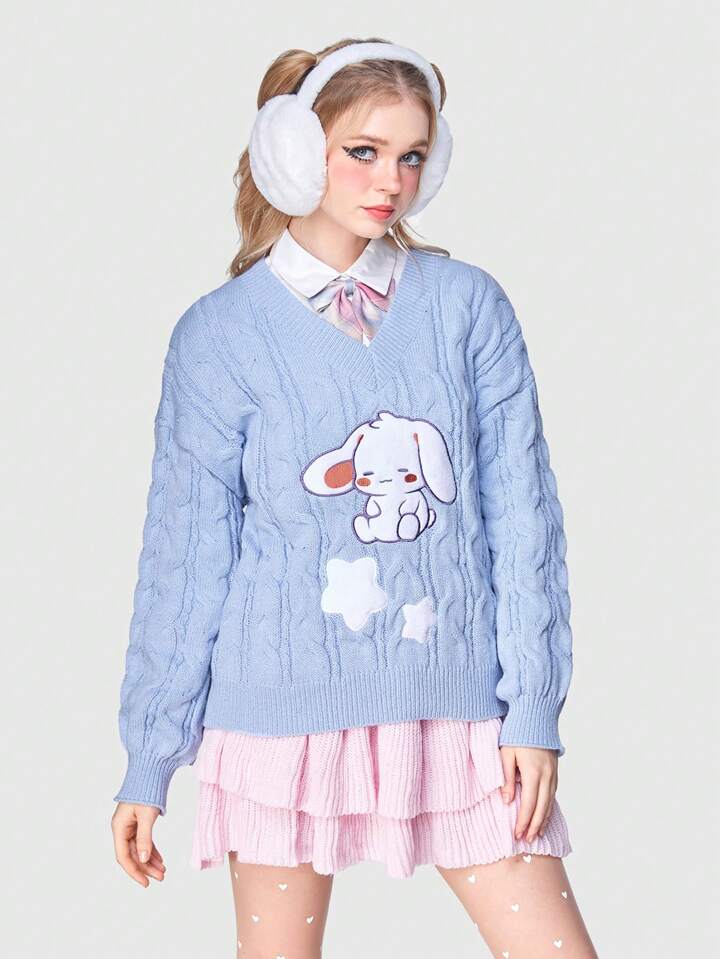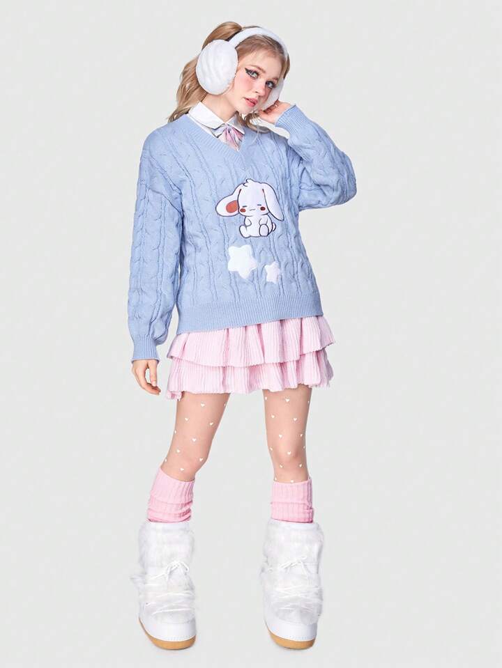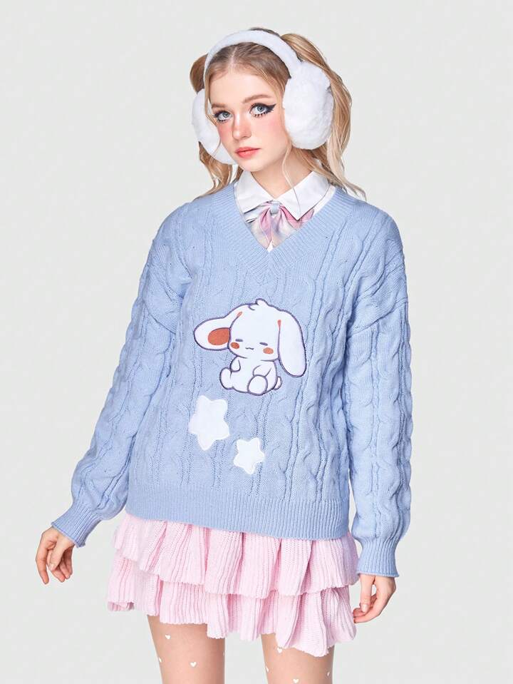 Kawaii Cartoon & Star Pattern Cable Knit Drop Shoulder Sweater Without Blouse