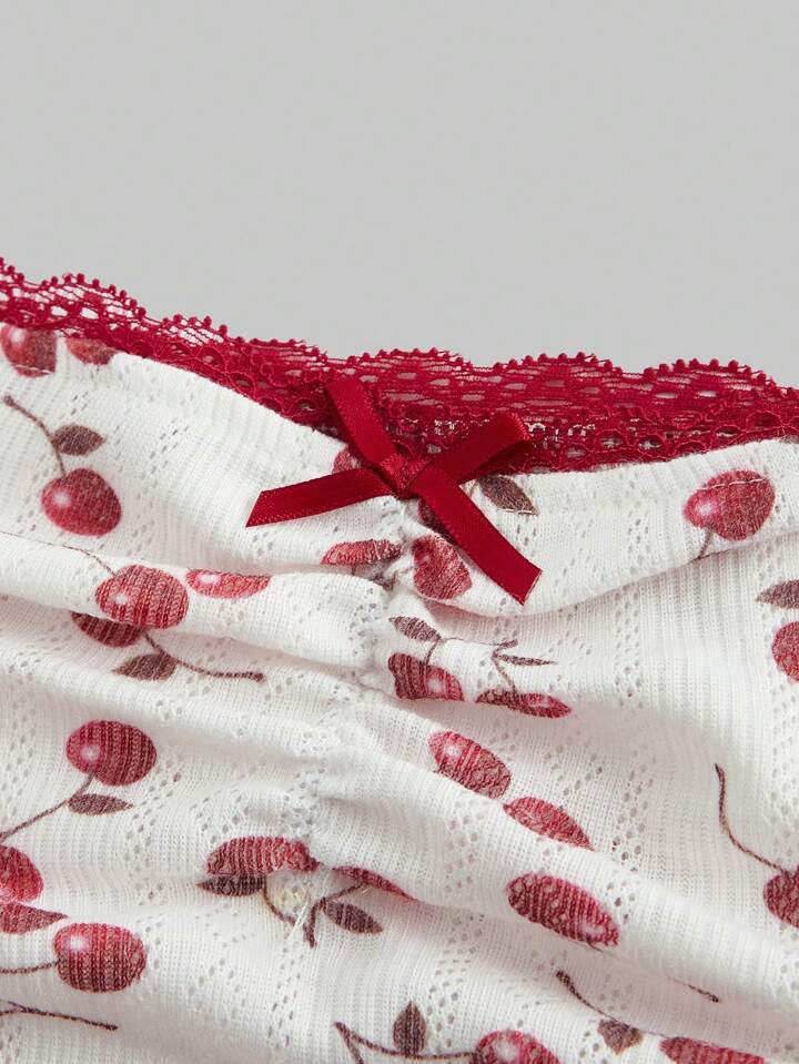 Kawaii Casual Yet Sexy Lace & Cherry Patterned Top With Bowknot And Ruffled Elastic Hem For Ladies' Holiday Or Vacation, School