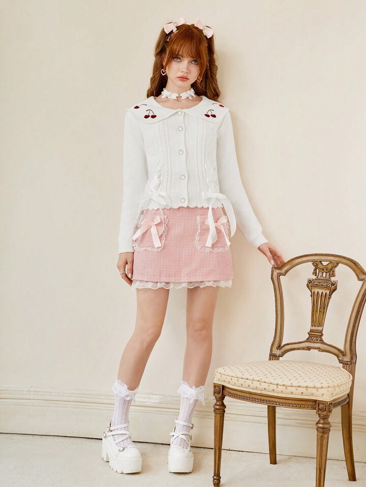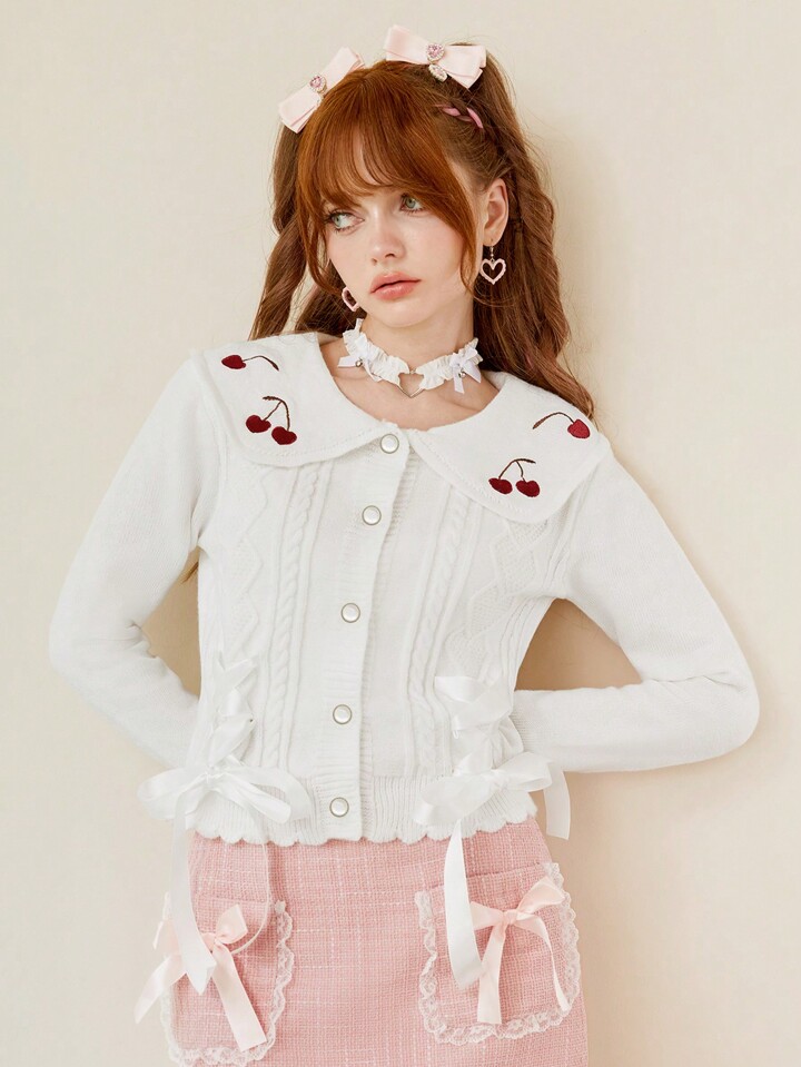 Kawaii Cherry Embroidery Scallop Trim Cardigan
