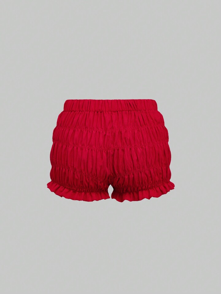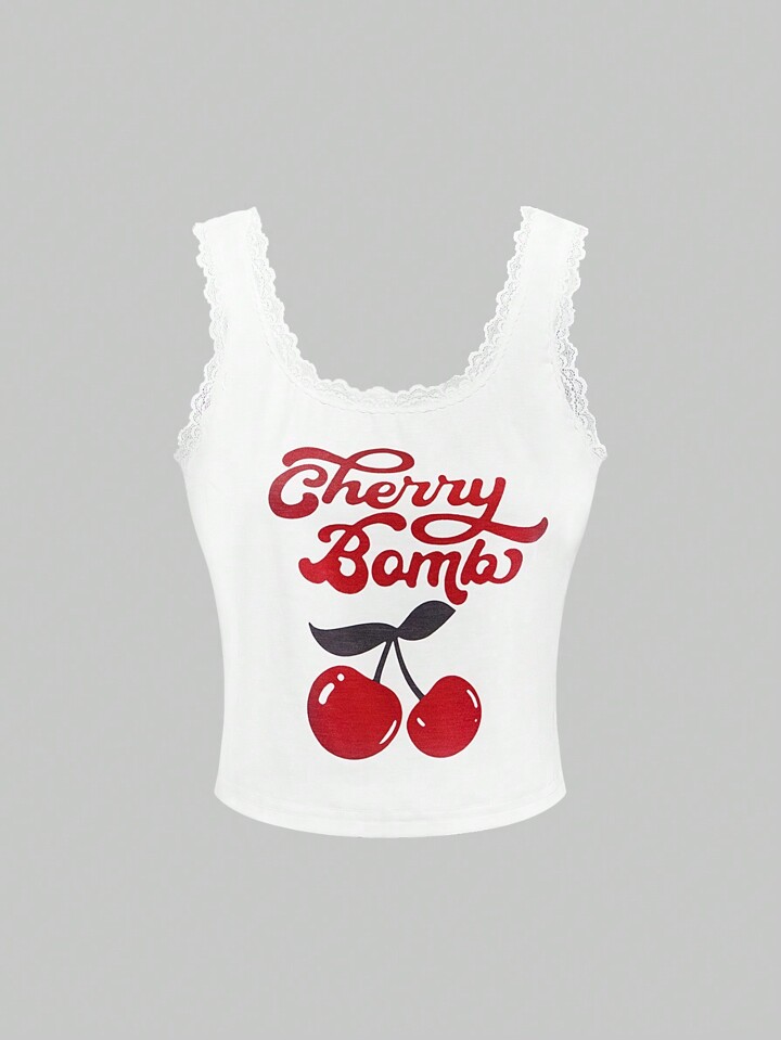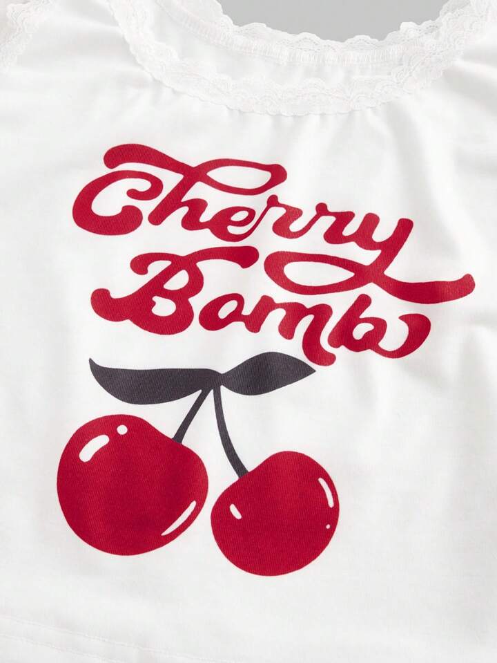 Kawaii Cherry Print Lace Patchwork Ruffle Bubble Shorts Camisole Casual Summer Pajama Set, Countryside Style