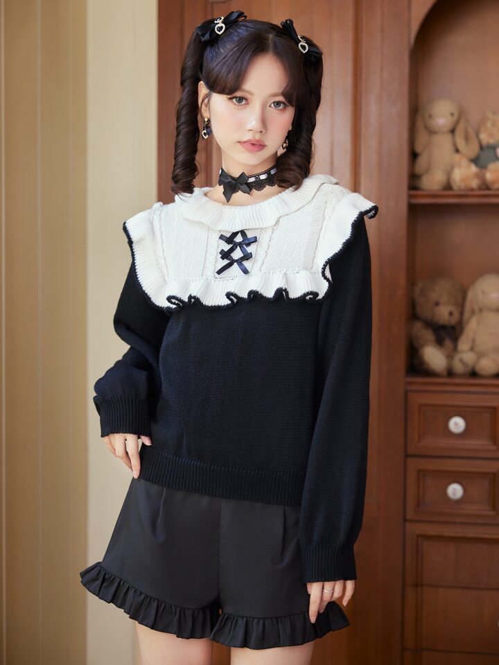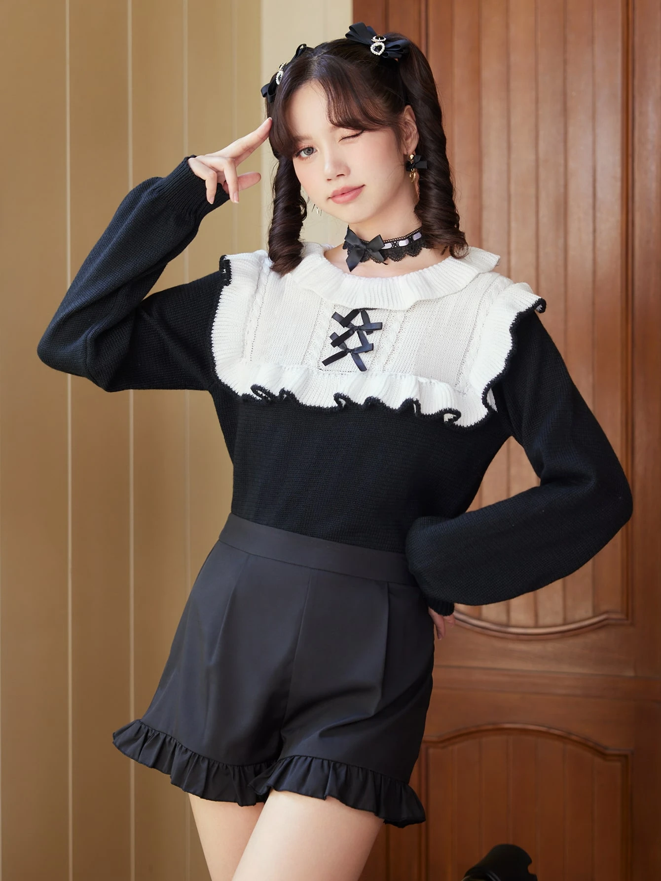 Kawaii Colorblock Ruffle Hem Bow Decor Sweater