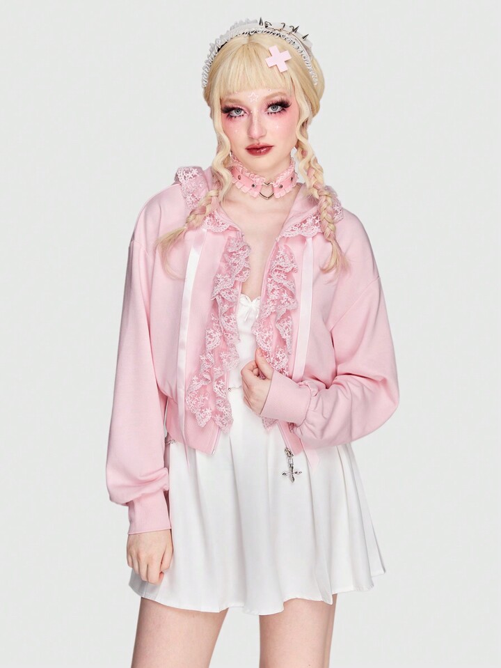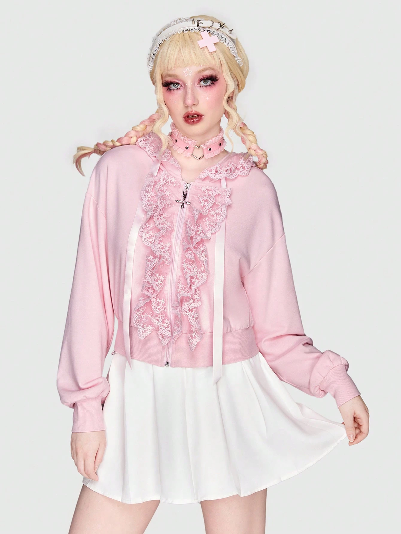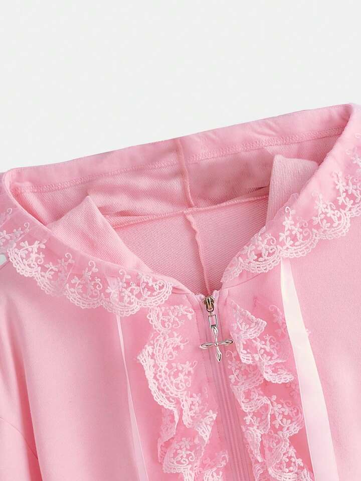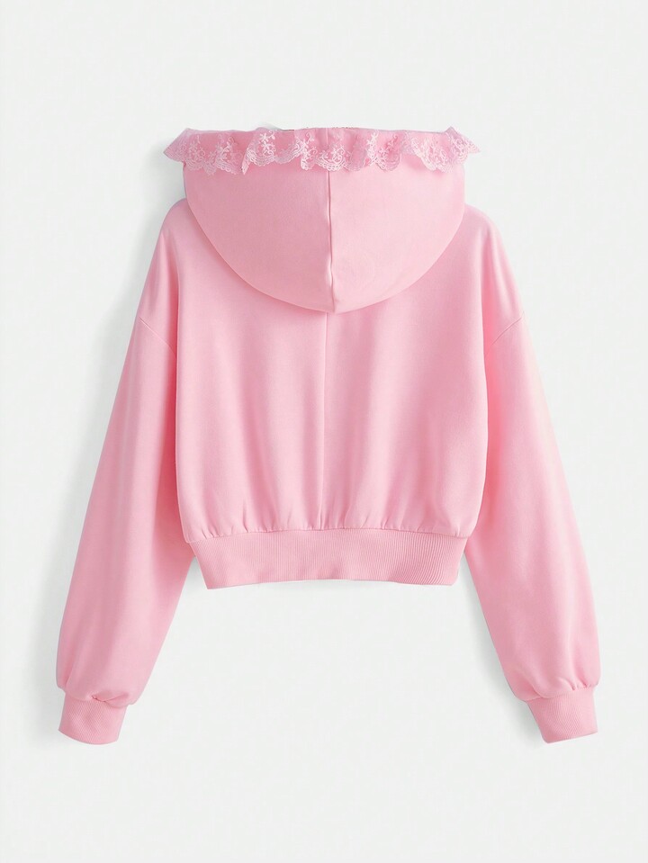 Kawaii Contrast Floral Lace Drop Shoulder Drawstring Hoodie