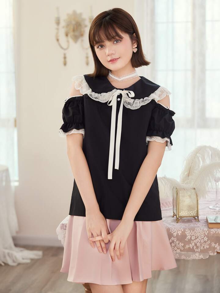 Kawaii Contrast Lace Cut Out Bow Blouse