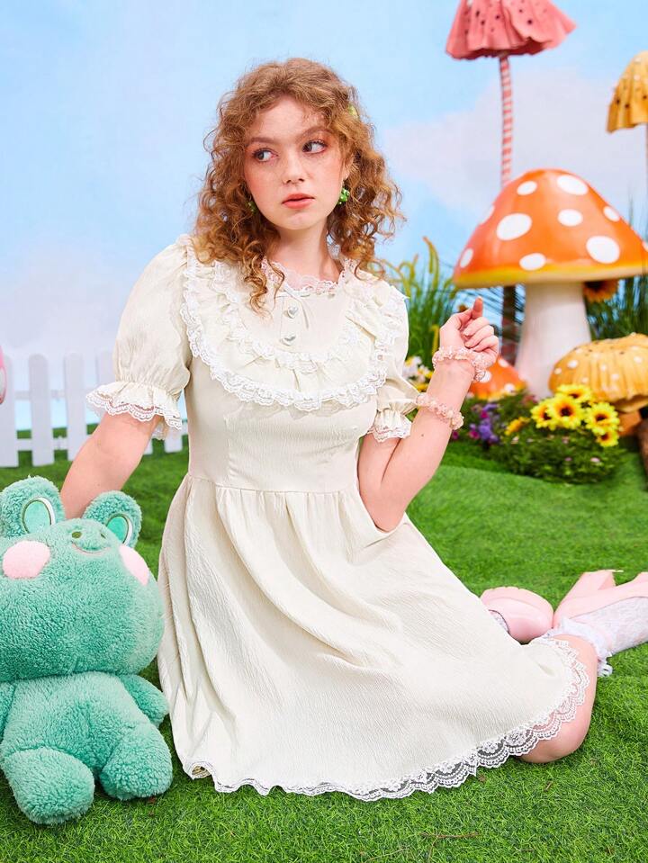 Kawaii Contrast Lace Ruffle Trim Puff Sleeve Dress