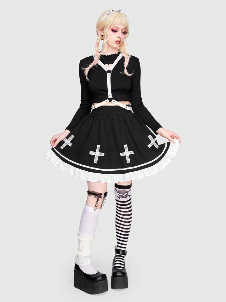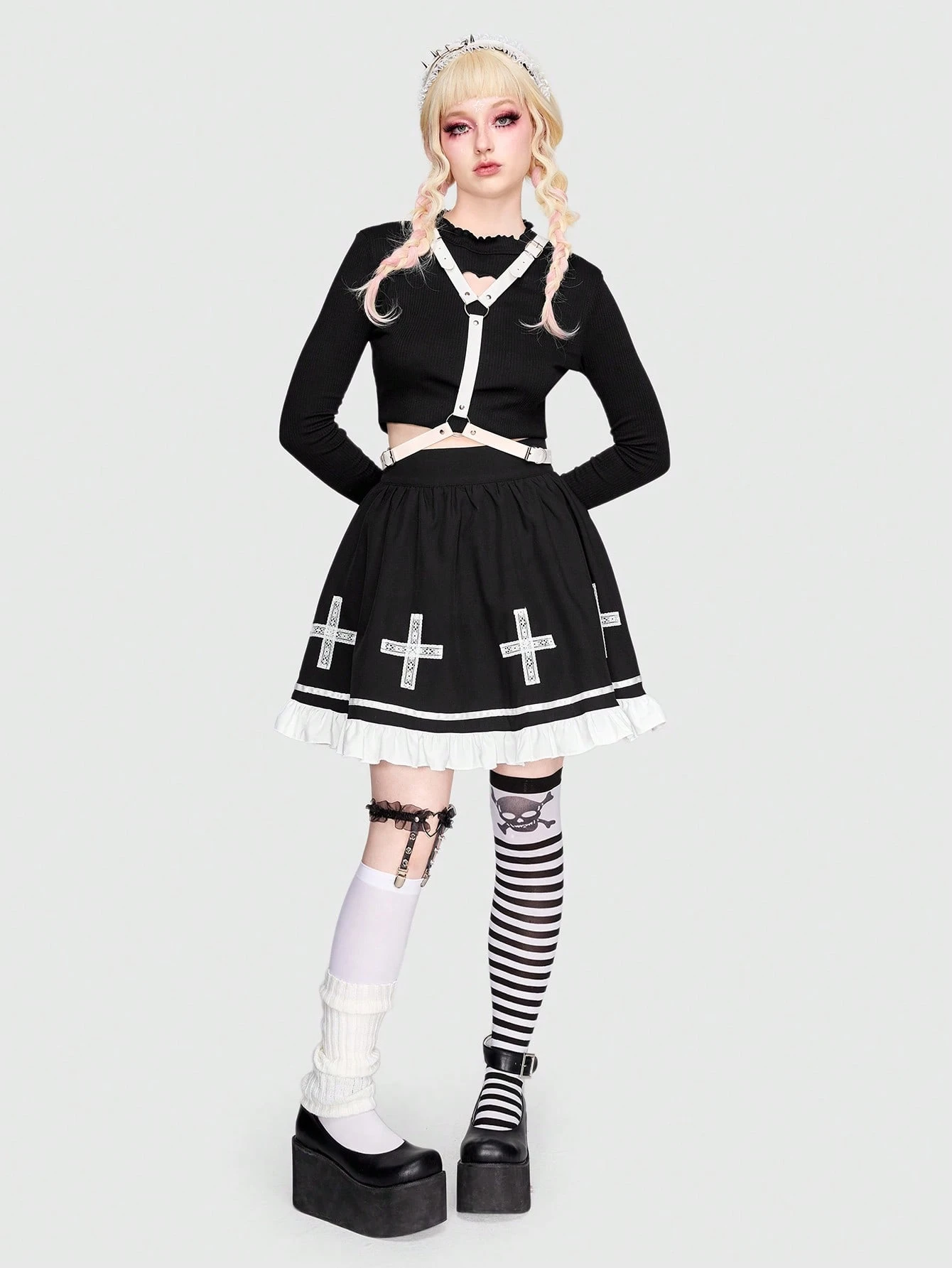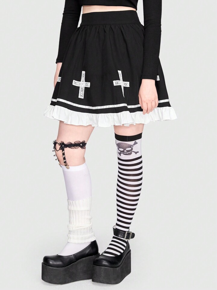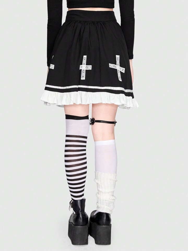 Kawaii Contrast Ruffle Hem Lace Cross Pattern Skirt