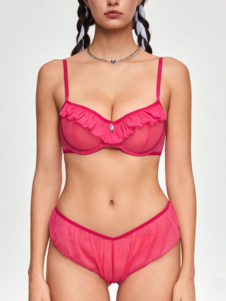 Kawaii Customized Princess Exclusive Adornment With Underwire, Sweet Pink Diamond, Romantic Ruffles Lingerie Set