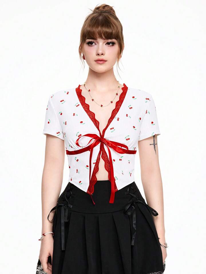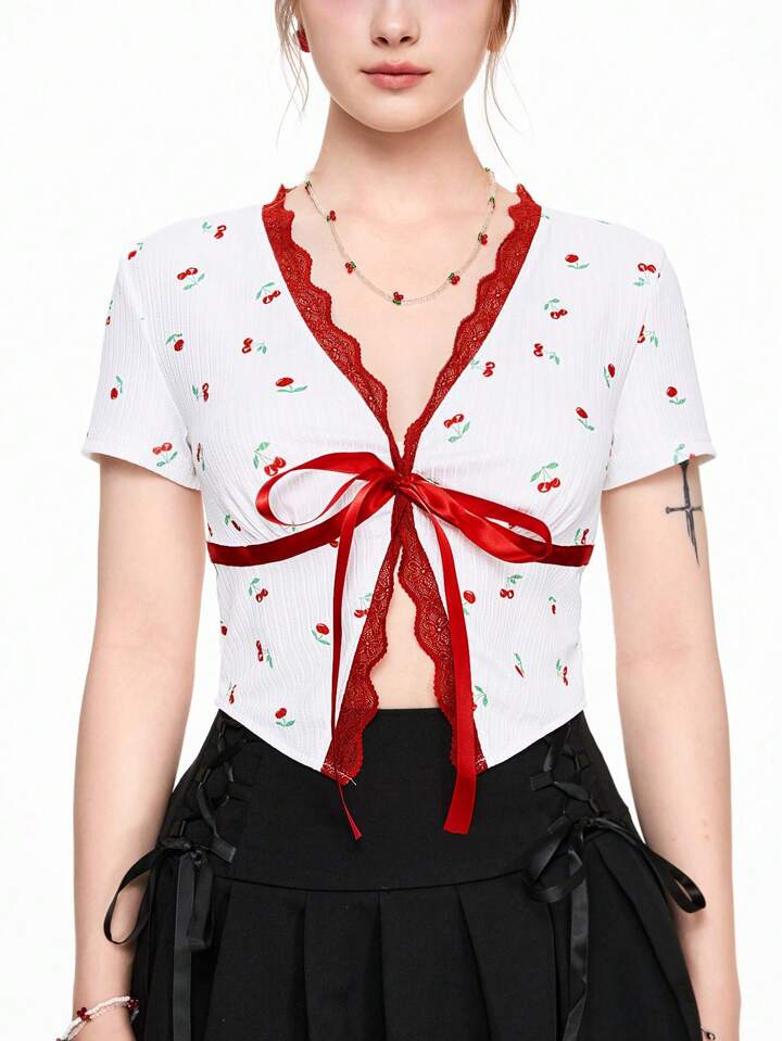 Kawaii Cute Cherry Print Slim Fit Cardigan With Bow & Lace Trim Sexy T-Shirt For Women