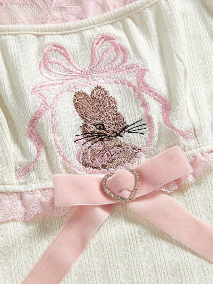 Kawaii Cute Lace Trimmed Bow Bunny Embroidered Off Shoulder Tee, Mock 2 Pieces Sleeveless Shirt For Summer Beach, Graduation, Easter, Concert, Nashville Vacations, Casual