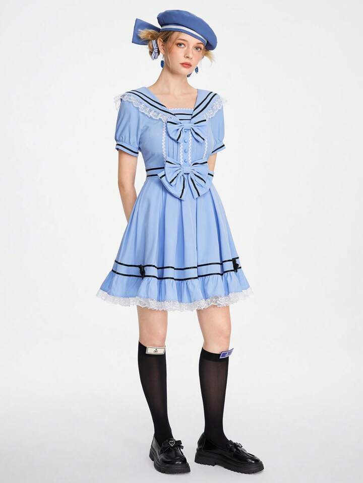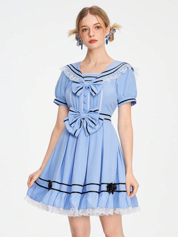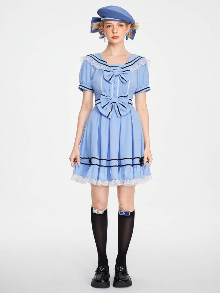 Kawaii Cute Lolita Style Sweet Lady Collared Bowknot Fashion Dress, School