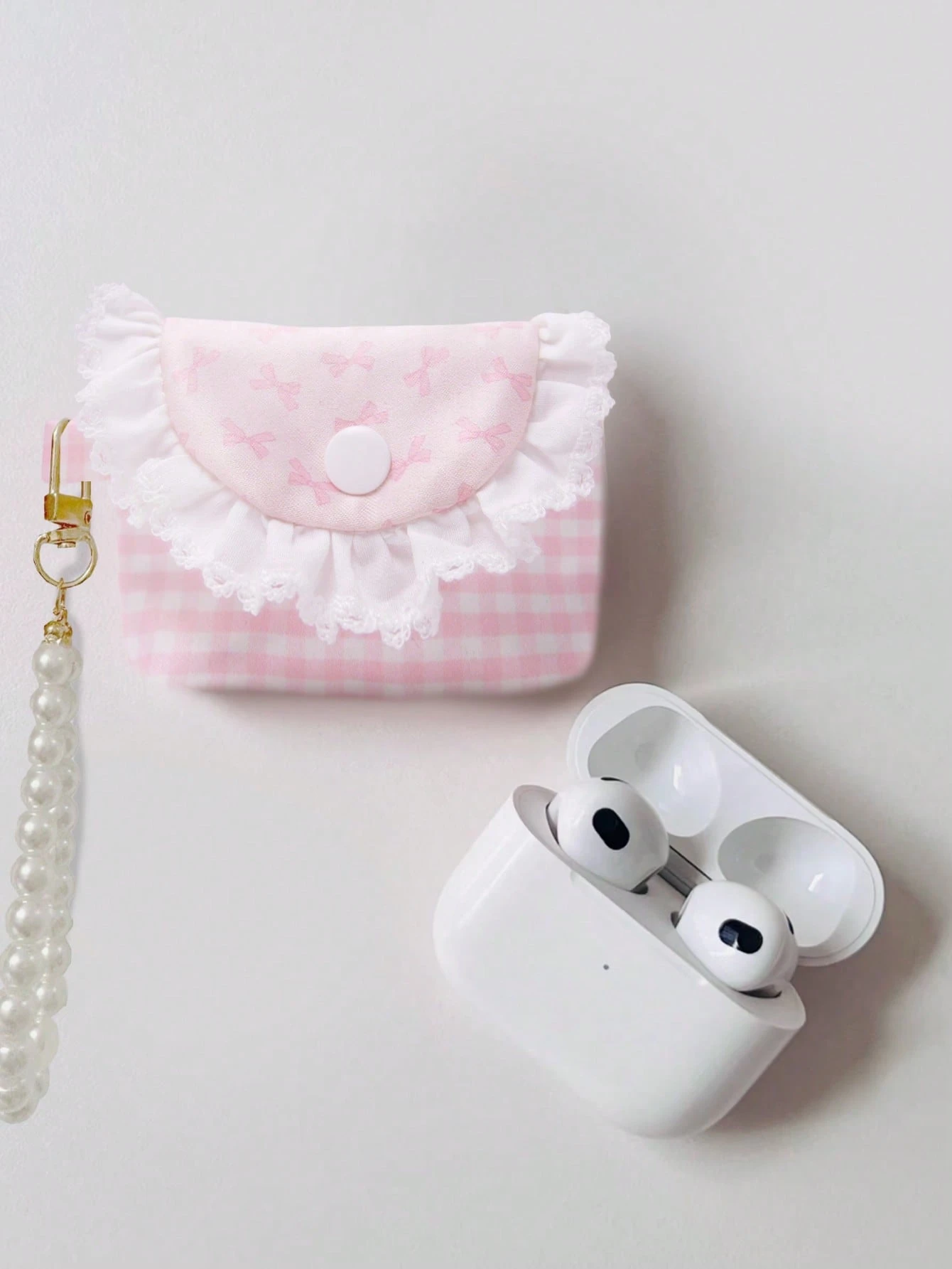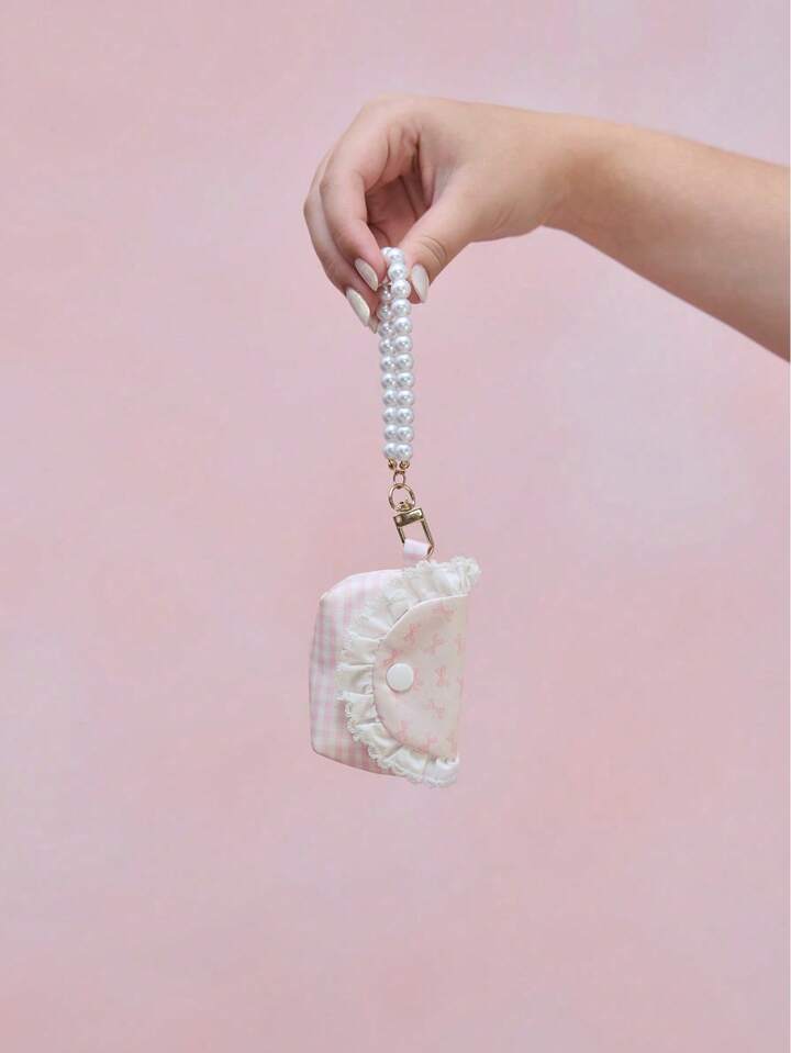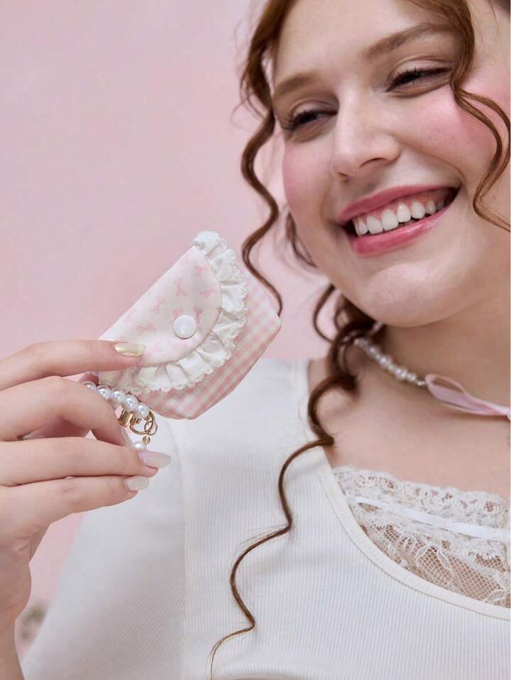 Kawaii Cute Pink Bow Patterned Portable Mini Pouch, Coin Purse, Earphone Case With White Lace
