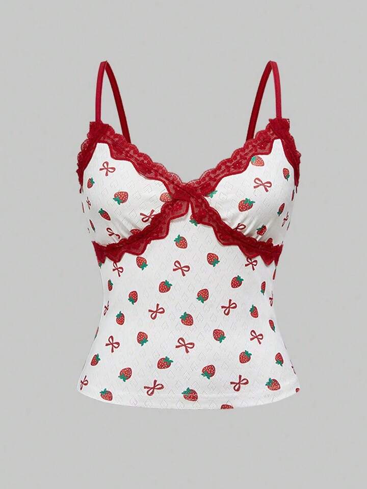 Kawaii Cute Strawberry Y2K Style Lace Trim Casual Red And White Cami Tank Top For Women