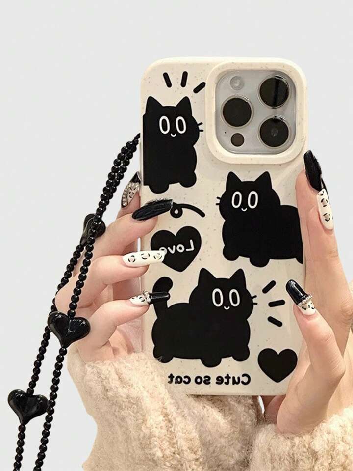 Kawaii Cute & Sweet Black Cat Heart Lanyard Beige Bellflower Phone Case Compatible With IPhone 12/13/14 Series Phones