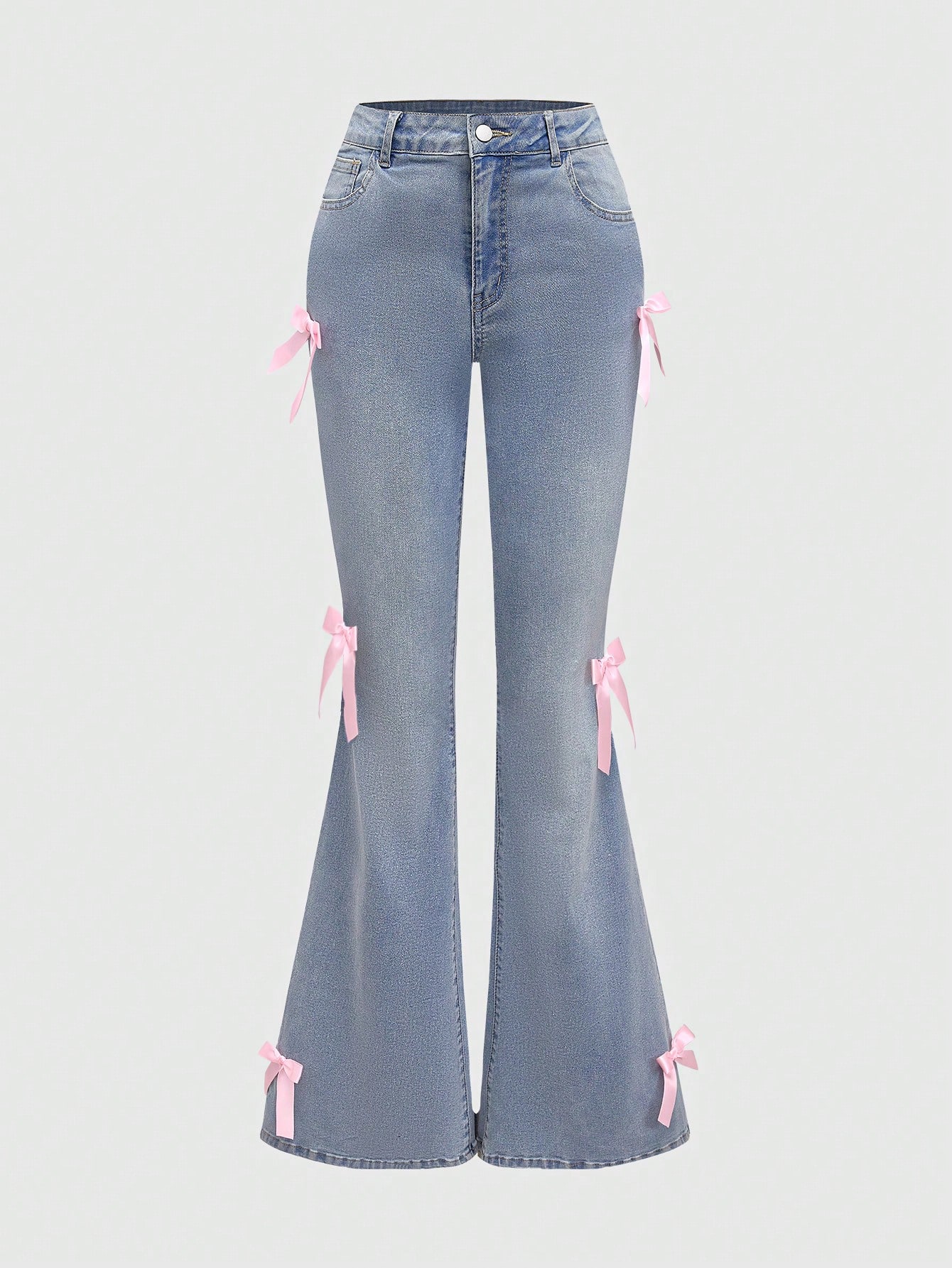 Kawaii Cute Sweet Bow & Heart Applique Women's Slim Flare Jeans