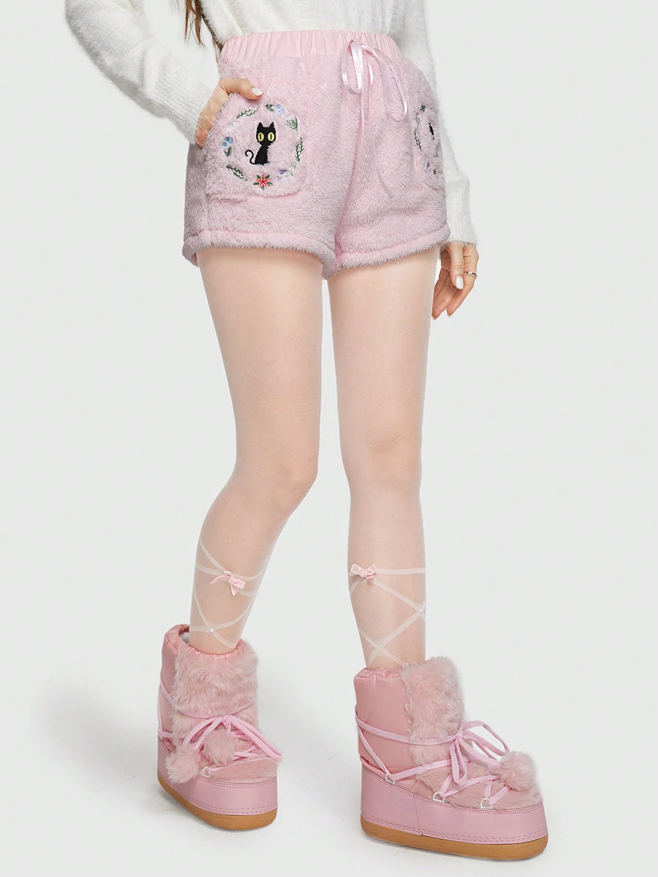 Kawaii Embroidery Cartoon Pattern Knot Elastic Waist Shorts