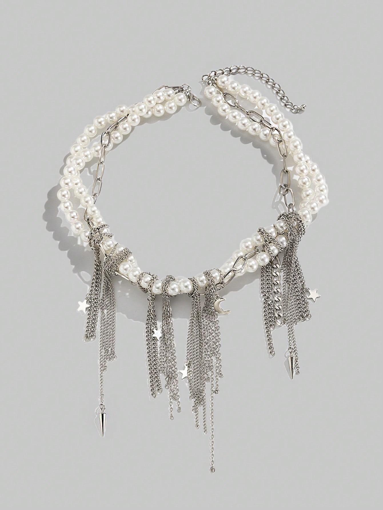 Kawaii Fashionable Punk Style Minimalist Star & Moon Iron Alloy Tassel Faux Pearl Necklace